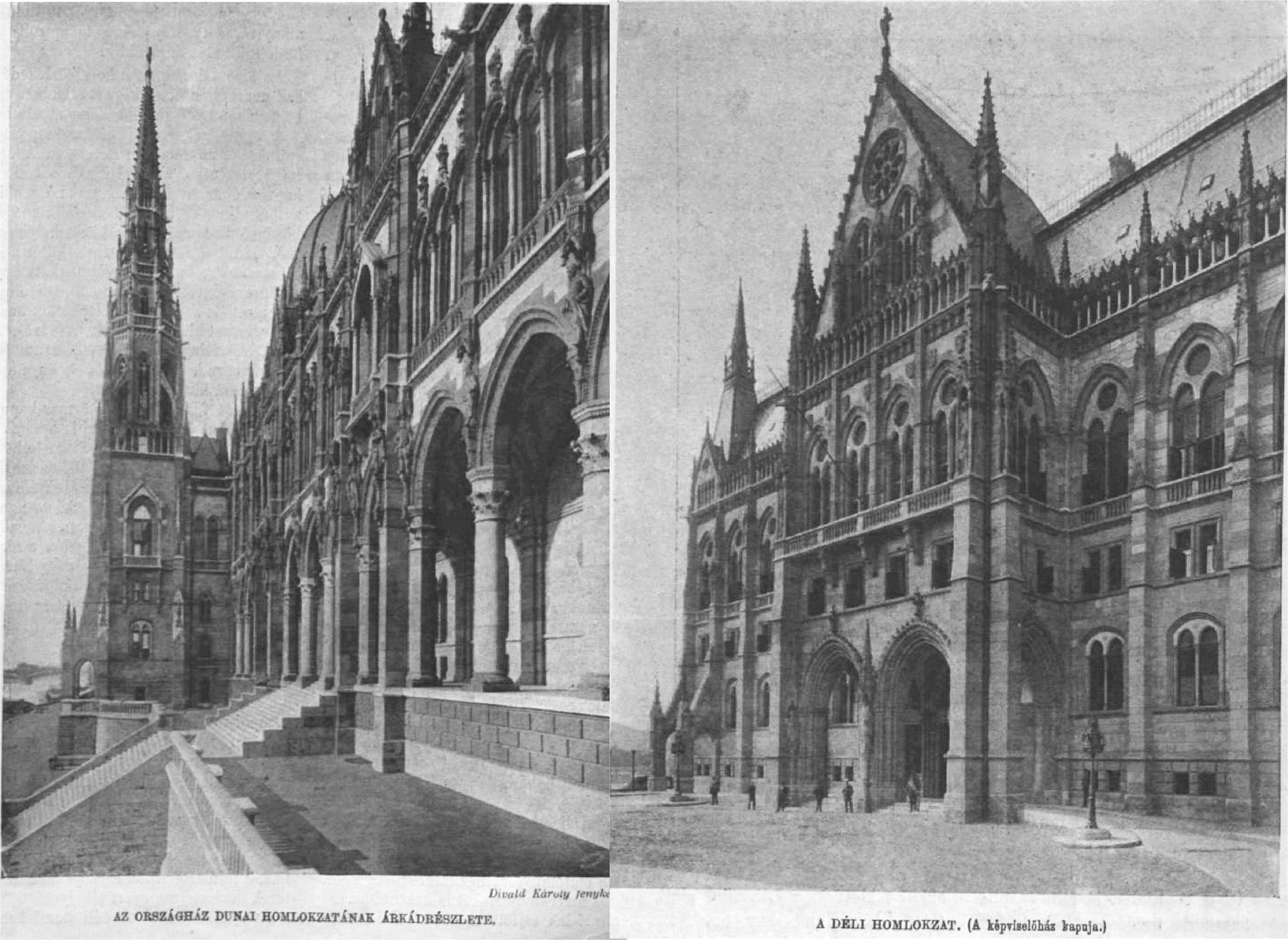 1885년에 착공하여 1896년 헝가리 건국 1000주년에 맞춰 개관할 예정이었으나, 1902년에 건물의 열쇠가 넘겨졌고,[10] 1904년에 이르러서야 완공되었다.[11] 설계자인 슈타인들은 완공 전에 시력을 잃고 1902년 사망하여 완공을 보지 못했다. 국회의사당 건설에는 약 10만 명의 사람들이 참여했으며, 4천만 개의 벽돌, 50만 개의 보석과 40kg의 금이 사용되었다.[12]