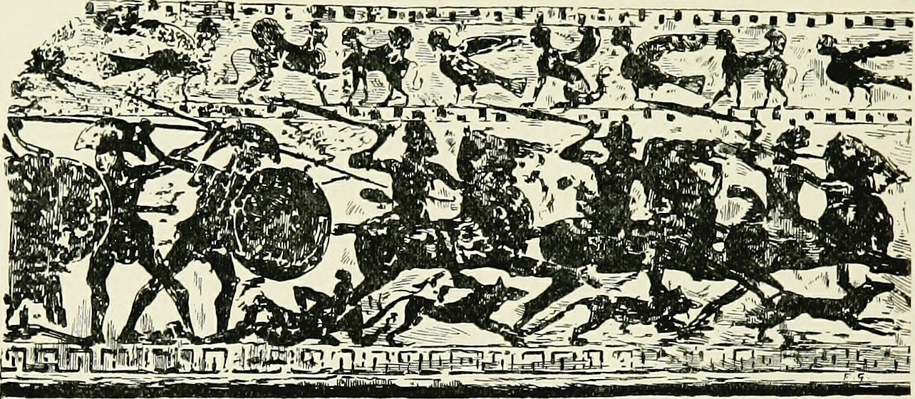 - '''기원전 7세기 중반''': 에페소스와 마이안드로스 강가의 마그네시아 간의 전쟁에서 기병들은 전쟁견과 창을 든 보조자를 동반했다. 개가 먼저 적의 대열을 무너뜨리고 창 공격과 기병 돌격이 이어졌다.[12]