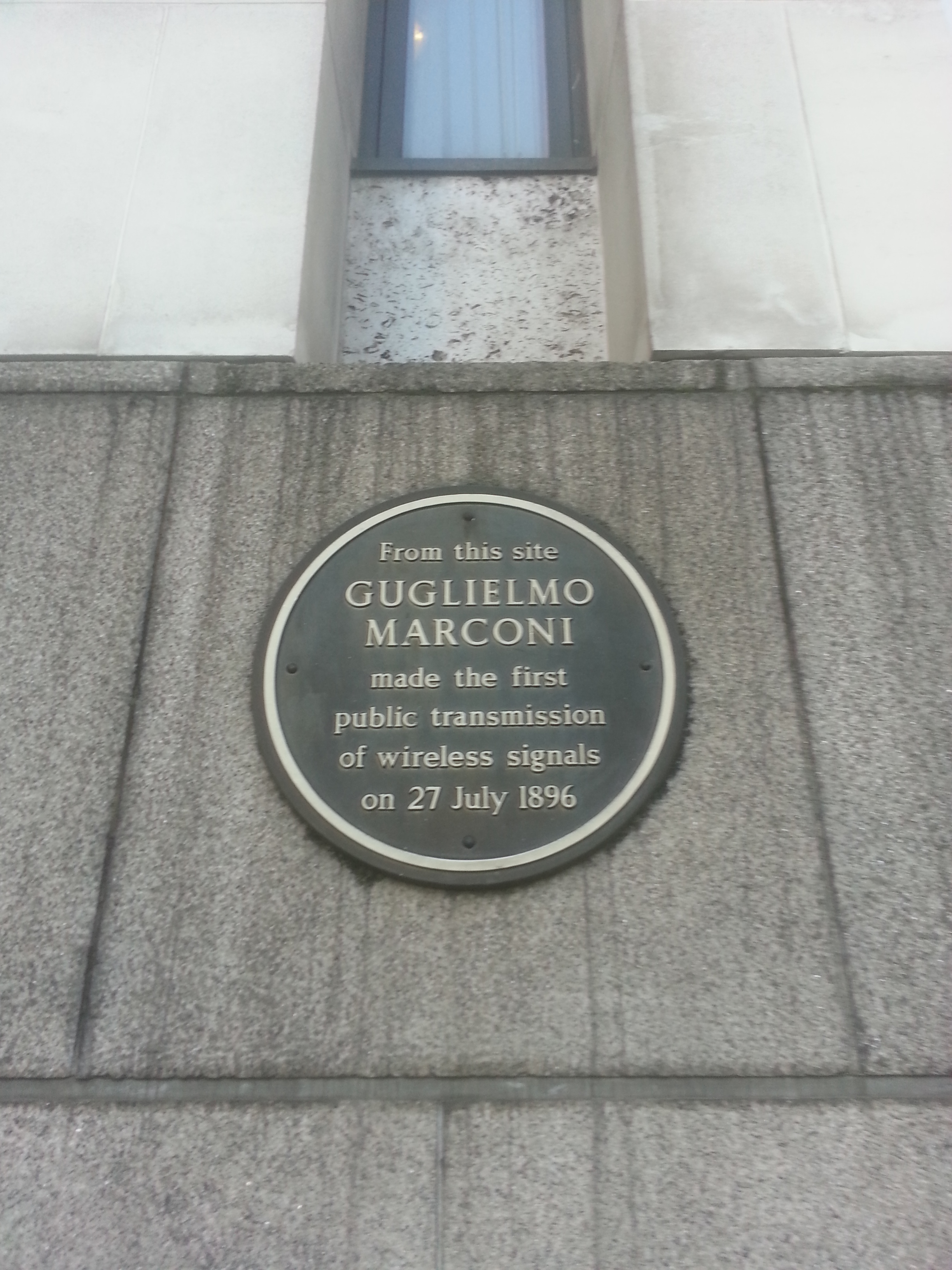 1896년, 마르코니는 어머니와 함께 런던으로 건너가 후원자를 찾았고, 영국 우정청(GPO)의 수석 전기 기술자 윌리엄 프리시(William Preece)의 지원을 받게 되었다.[128] 마르코니는 영국에서 일련의 시연을 통해 자신의 기술력을 입증했다. 1896년 7월 27일, 우정청(GPO)과 저축은행 옥상 사이에서 첫 공개 시연을 가졌고, 이 장소에는 현재 BT 그룹 본사 건물(en)이 있으며, 기념 명판이 설치되어 있다.[129][130]
