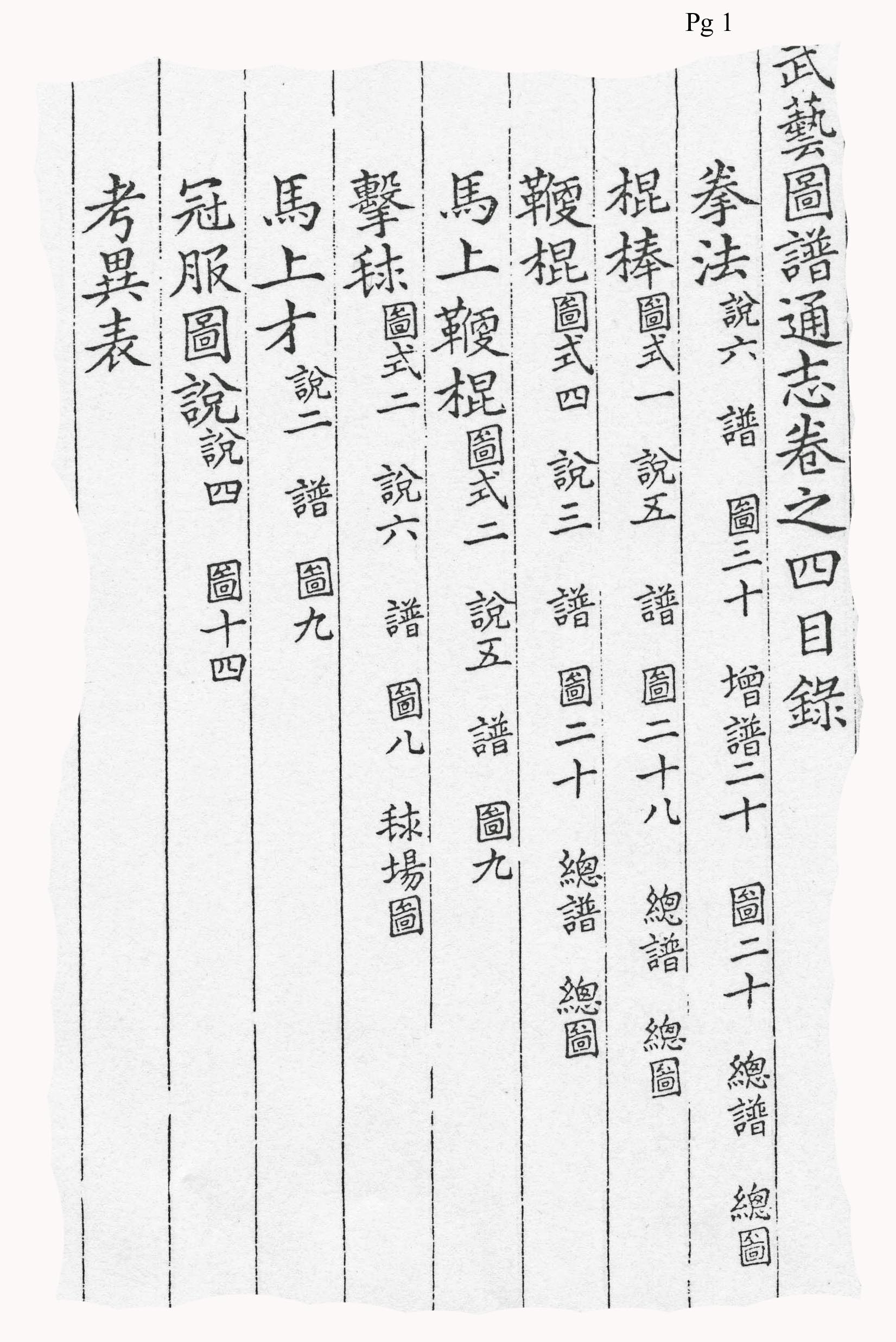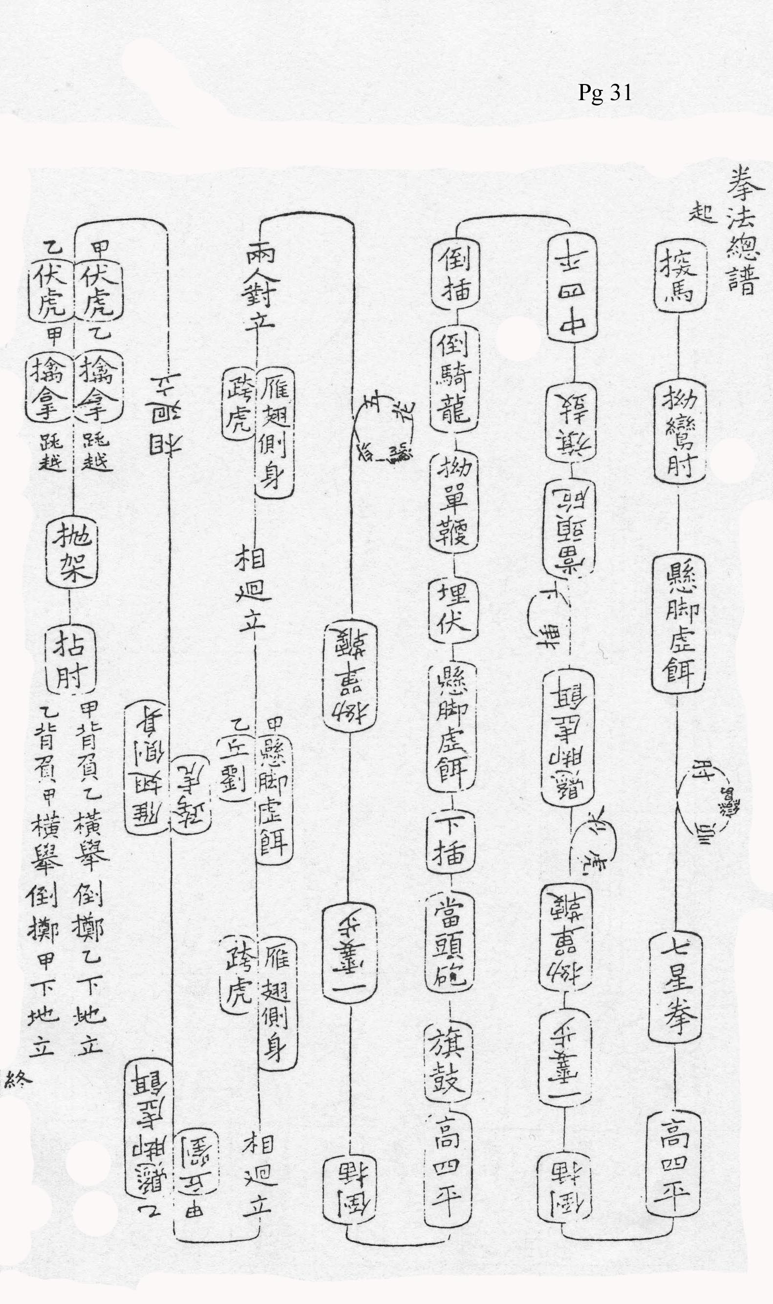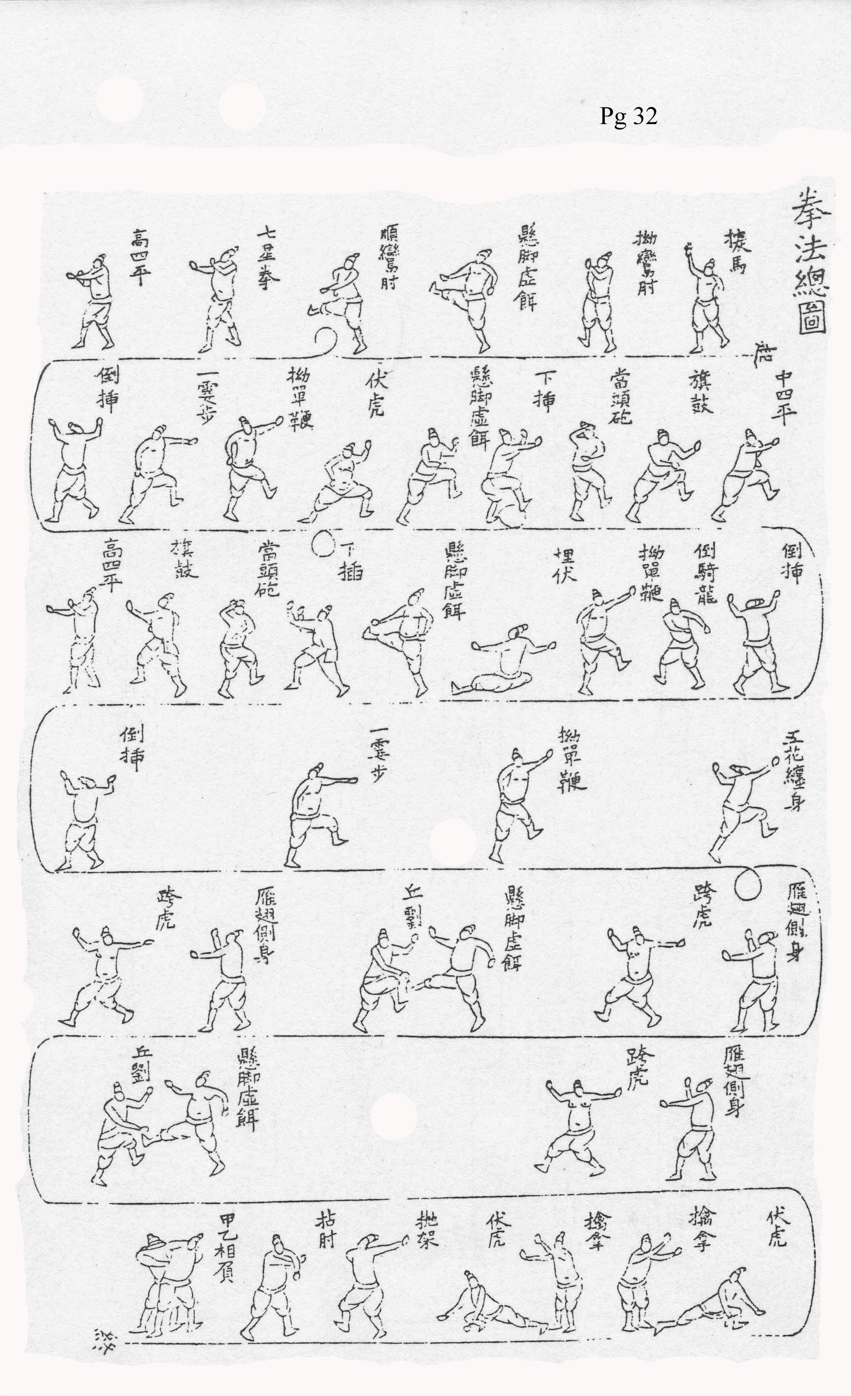 명나라 시대 저술 관례에 따라 각 기법은 당시 유행하던 짧은 시 형식으로 특징지어졌으며, 전투 기법의 본질을 담은 제목으로 구분되었다. ("여기에 우리는 자세를 설명하고, 미래의 학생들을 계몽하기 위해 격언을 덧붙였다.") 32가지 권법 목록은 다음과 같다.