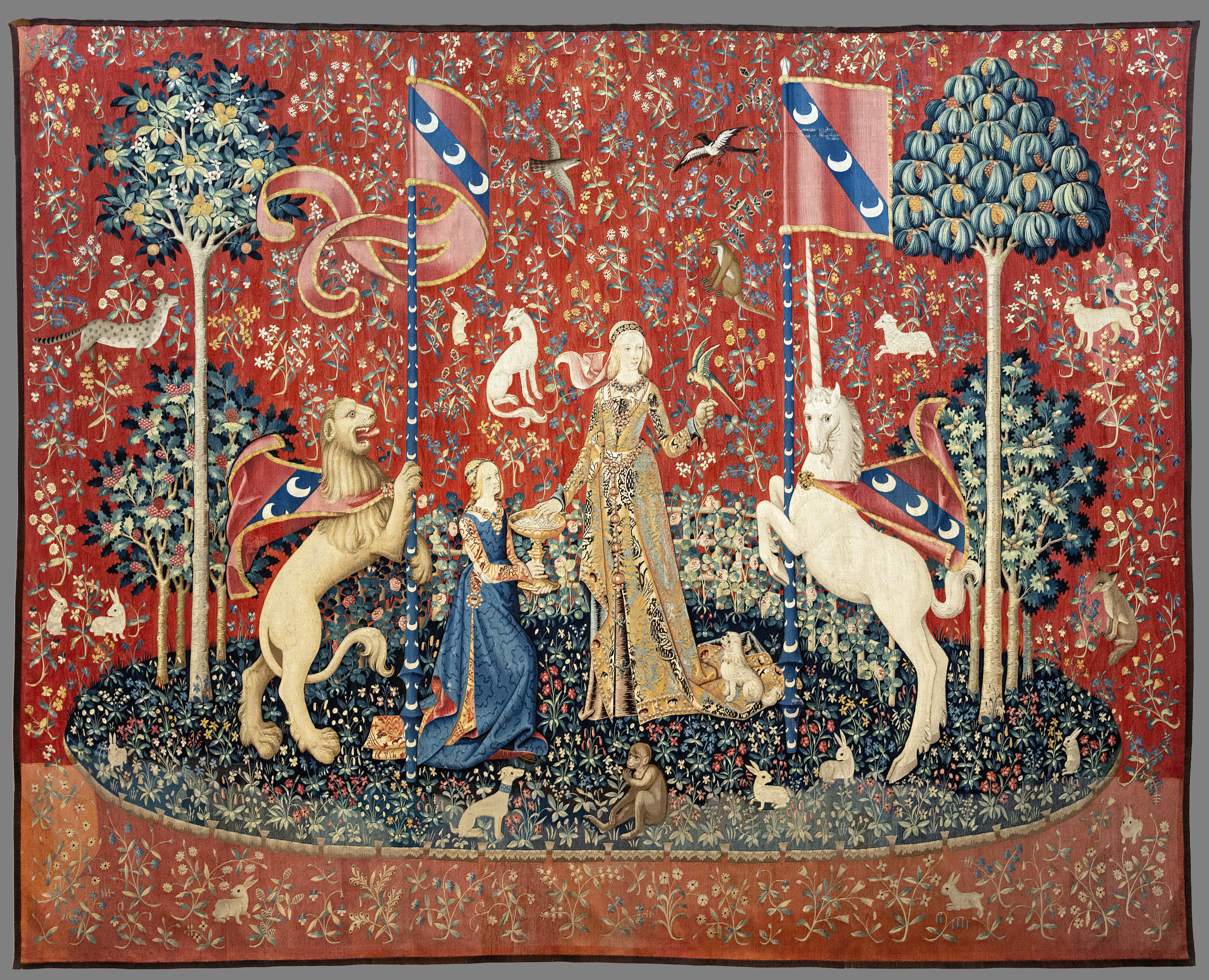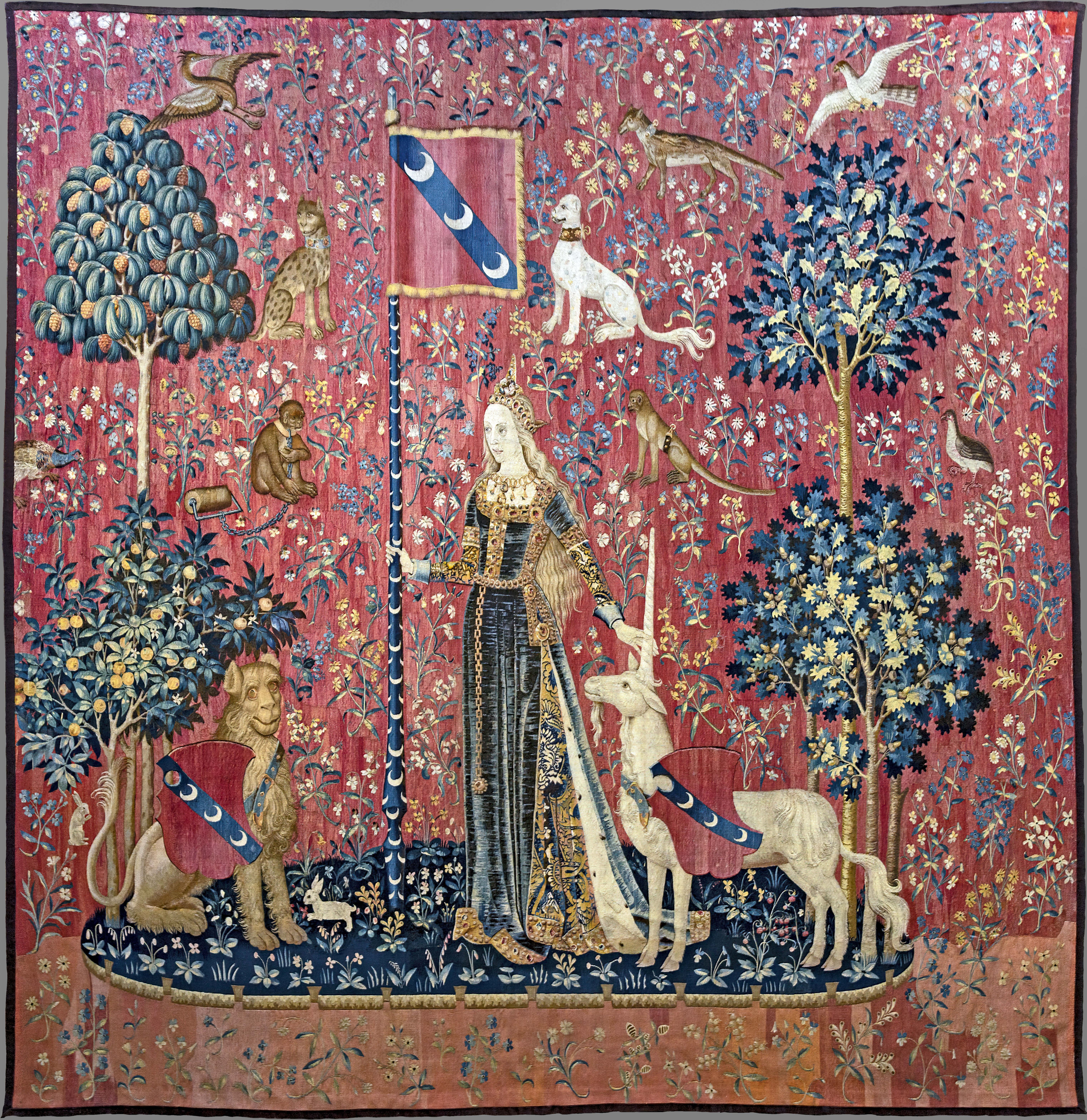 '귀부인과 일각수'는 여섯 개의 태피스트리 연작으로, 복잡한 주제를 담고 있다. 학자들은 이 작품이 현세의 쾌락과 궁정 문화를 우의적으로 표현한 것이라는 데 동의한다.[3]