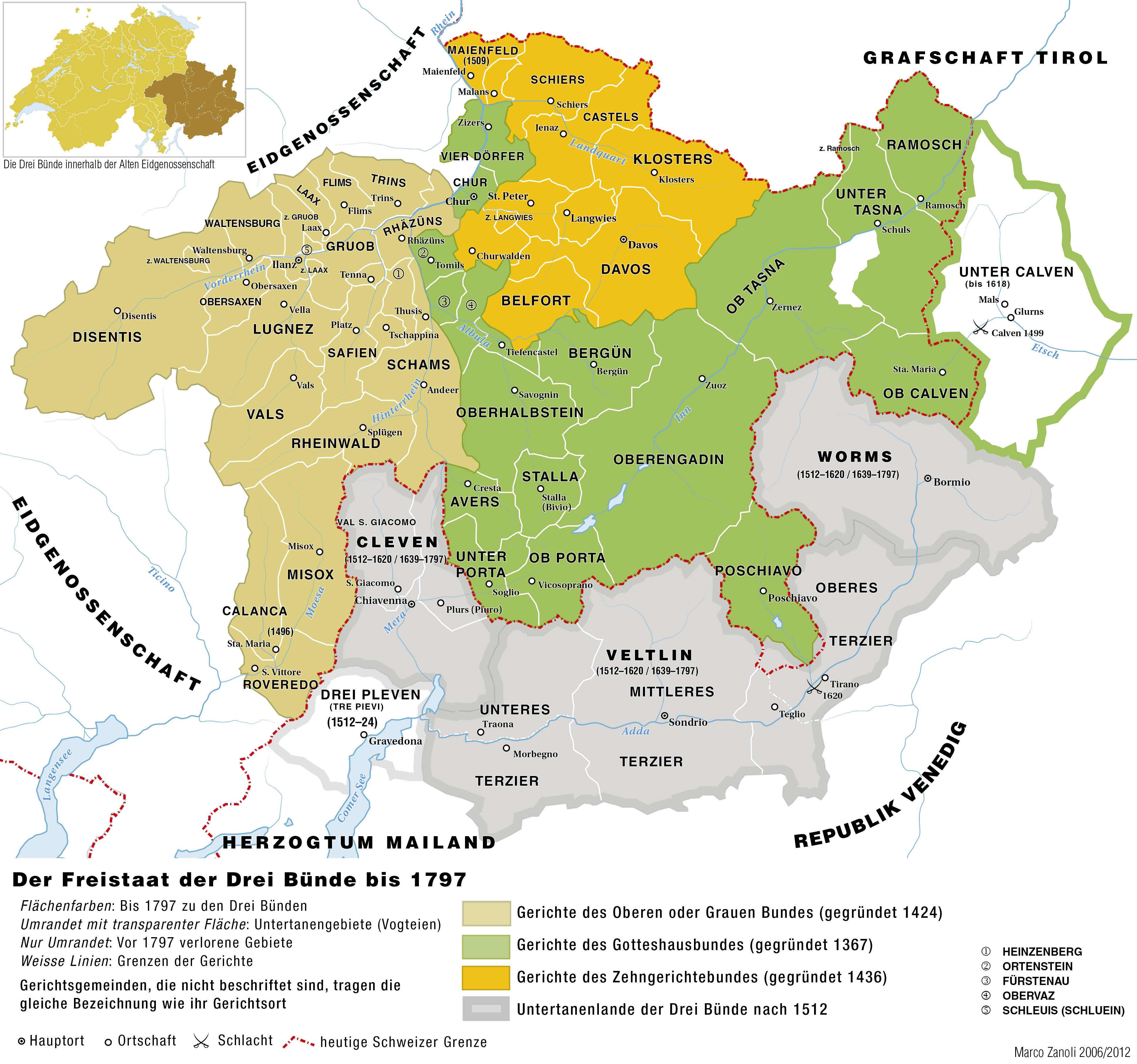 쿠어 주교의 관할권에 대한 마지막 흔적은 1526년에 폐지되었다. 1520년의 무소 전쟁(Musso war)은 세 동맹을 스위스 연방에 더욱 가깝게 만들었다.