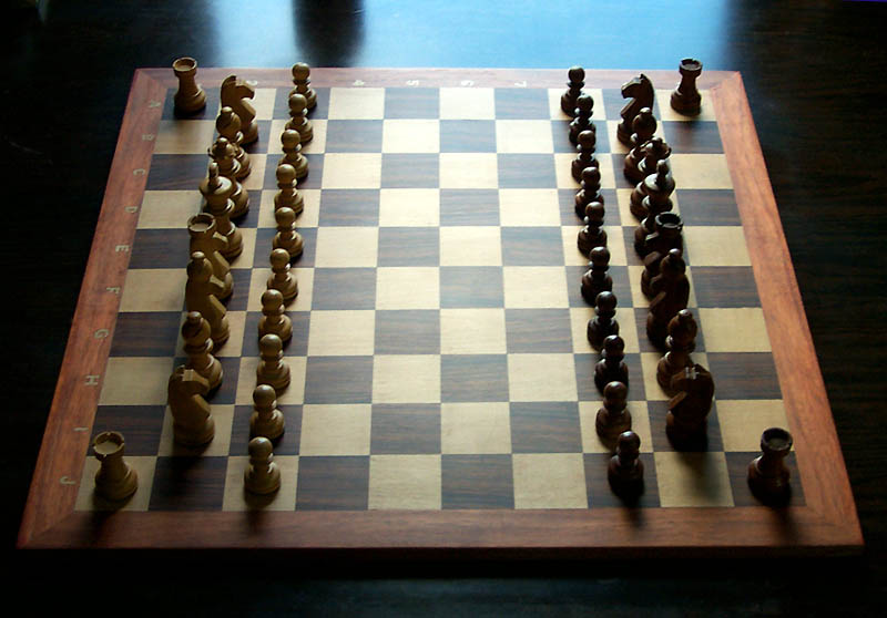 기물은 각 플레이어의 첫 번째와 두 번째 열에 배치되며, 룩은 첫 번째 열에 혼자 배치된다.[1] 폰은 각 플레이어의 세 번째 열에 배치된다.[1] 룩은 다른 기물에 덜 막히기 때문에 게임 초반에 더 쉽게 활성화될 수 있다.[1]3. 게임 예시