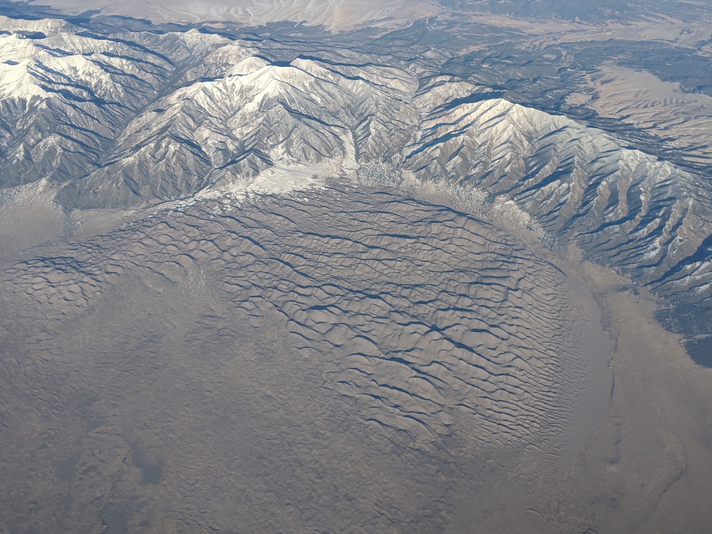 산루이스 계곡은 거대한 지각판의 회전으로 상그레 데 크리스토 산맥이 융기하면서 형성되었다. 계곡 서쪽에 있는 산후안 산맥은 화산 활동으로 만들어졌다. 두 산맥에서 온 퇴적물은 녹는 빙하와 비로 인한 물과 함께 계곡을 채웠다. 사구 기슭의 메다노 크릭 등에서 발견되는 큰 암석은 일부 퇴적물이 격렬한 폭우에 휩쓸려 내려갔음을 나타낸다.[11]