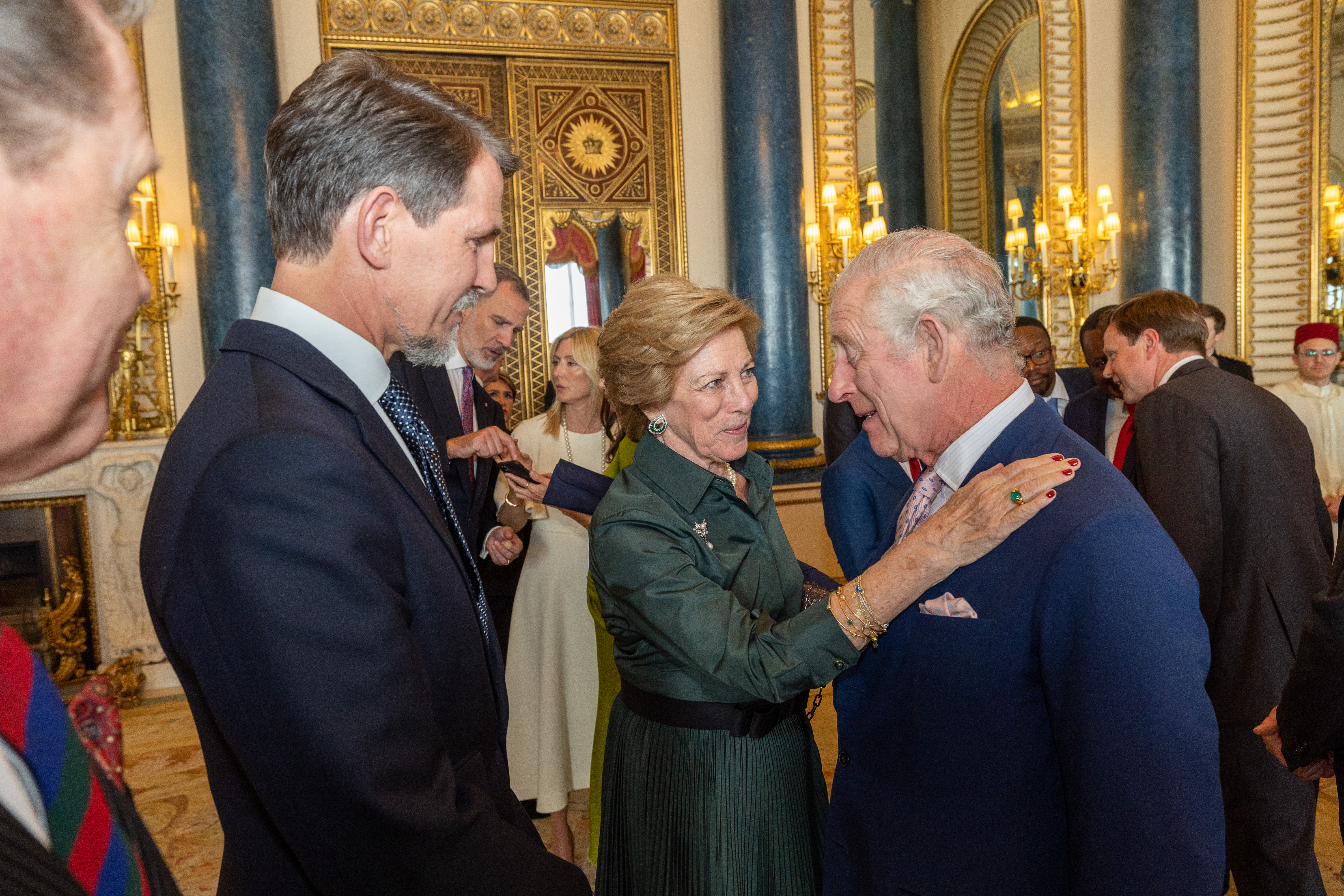 파블로스(''왼쪽'')와 그의 어머니 안네-마리(''가운데'')가 찰스 3세(오른쪽)의 대관식 리셉션에 참석했다. 파블로스의 아내 마리-샹탈과 사촌 펠리페 6세는 파블로스와 안네-마리 사이에 배경으로 있다.