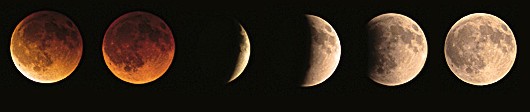 지구가 달에 드리우는 그림자는 월식이다.[5] 월식 직전에 달이 붉은색으로 보이는 이유는 달이 지구의 부분그림자에 가려져 햇빛에 반사되지 않기 때문이다. 반대로 달이 지구에 드리우는 그림자는 일식이다.[5] 일식은 지상에서 관측하는 사람에게는 태양 광구면을 달이 가려 태양으로부터의 빛을 없애는 천문 현상으로 보이지만, 우주 공간에서 지구 표면을 보면 달의 그림자가 서서히 크기를 키우며 지구 표면을 통과해 가는 현상으로 보인다. 이때 지구 표면에 생기는 달의 그림자가 반영인 경우 부분 일식이며, 극히 일부 지역에서 본영이 생기는 경우 지구상의 이 지역에서는 개기 일식이 일어난다.