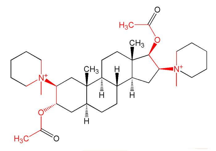 근육 이완 및 마비는 이론적으로 여러 부위에서 기능 중단을 통해 발생할 수 있다. 여기에는 중추 신경계, 수초화된 체성 신경, 비수초화된 운동 신경 종말, 니코틴성 아세틸콜린 수용체, 운동 종판, 근육 막 또는 수축 장치가 포함된다. 대부분의 신경근 차단제는 신경근 접합부의 종판에서 전달을 차단하여 작용한다. 일반적으로 신경 자극이 운동 신경 종말에 도달하면 칼슘 이온의 유입이 시작되어 아세틸콜린을 포함하는 시냅스 소포의 세포외배출을 유발한다. 아세틸콜린은 시냅스 틈을 가로질러 확산된다. 이는 아세틸콜린에스터레이스(AchE)에 의해 가수분해되거나 운동 종판에 위치한 니코틴성 수용체에 결합될 수 있다. 두 개의 아세틸콜린 분자가 결합하면 수용체에서 구조 변화가 일어나 니코틴성 수용체의 나트륨-칼륨 통로가 열린다. 이를 통해 및 이온이 세포로 들어가고 이온이 세포를 떠나 종판을 탈분극시켜 근육 수축을 유발한다.[8] 탈분극 후, 아세틸콜린 분자는 종판 영역에서 제거되고 아세틸콜린 에스터라제에 의해 효소적으로 가수분해된다.[5]정상적인 종판 기능은 두 가지 기전에 의해 차단될 수 있다. 투보쿠라린과 같은 비탈분극제는 작용제인 아세틸콜린이 니코틴성 수용체에 결합하여 활성화되는 것을 차단하여 탈분극을 방지한다. 또는 숙시닐콜린과 같은 탈분극제는 Ach를 모방하는 니코틴성 수용체 작용제이며, 수용체의 감도를 떨어뜨려 더 이상 활동 전위를 시작하고 근육 수축을 유발할 수 없을 정도로 탈분극시켜 근육 수축을 차단한다.[5] 이러한 두 종류의 신경근 차단제는 구조적으로 아세틸콜린과 유사하며, 많은 경우 판쿠로니움 (비탈분극제)과 같이 단단한 탄소 고리 시스템에 의해 앞뒤로 연결된 두 개의 아세틸콜린 분자를 포함한다.[5]