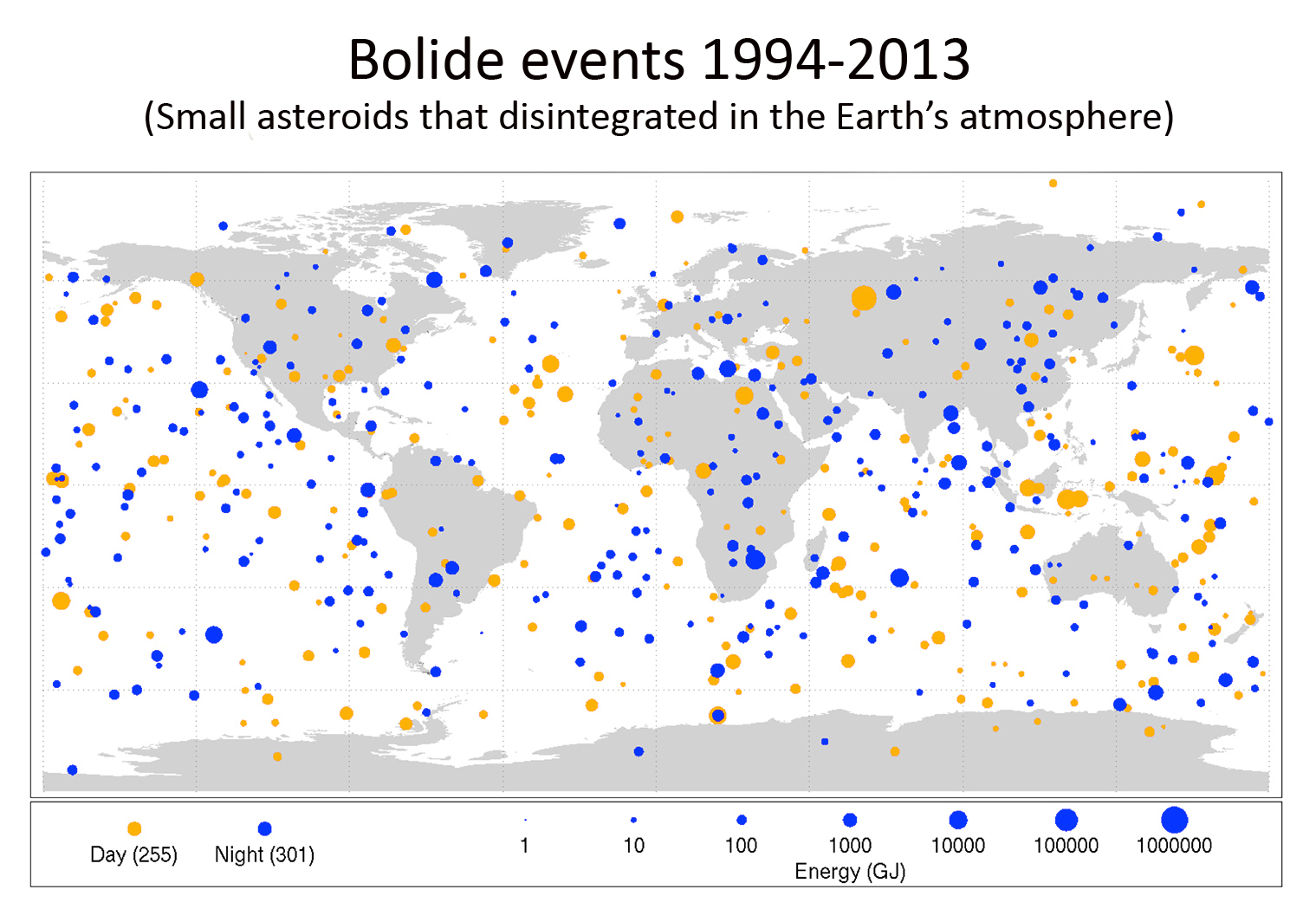 2013년 첼랴빈스크 유성은 이전에 알려지지 않은 20m 소행성이 러시아 도시 상공에서 폭발하여 400~500킬로톤에 해당하는 폭발력을 발생시킨 사건이다.[31]
