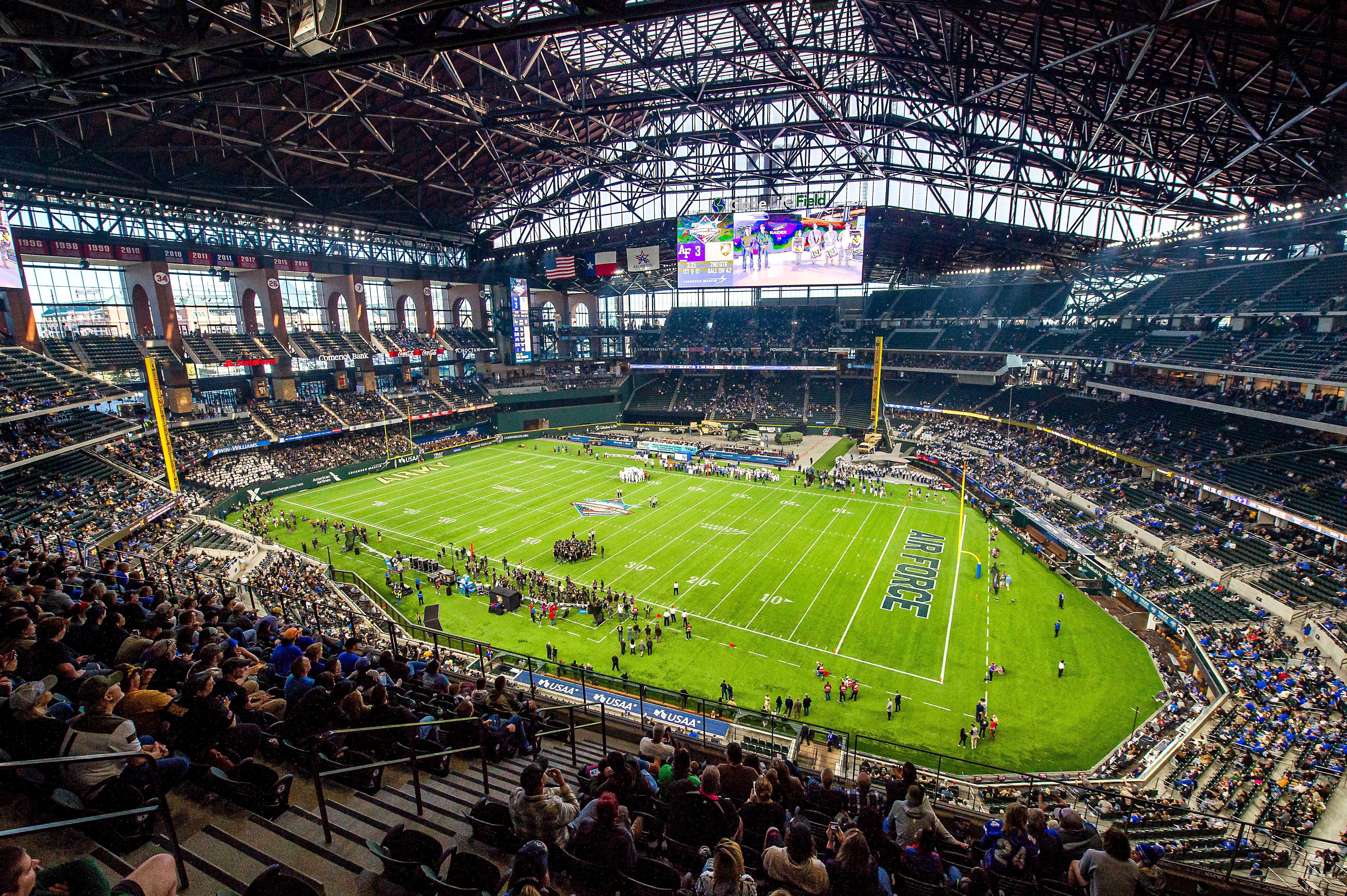 글로브 라이프 필드의 미식축구 경기 구성은 엔드 존이 좌익수와 1루에 위치한다.