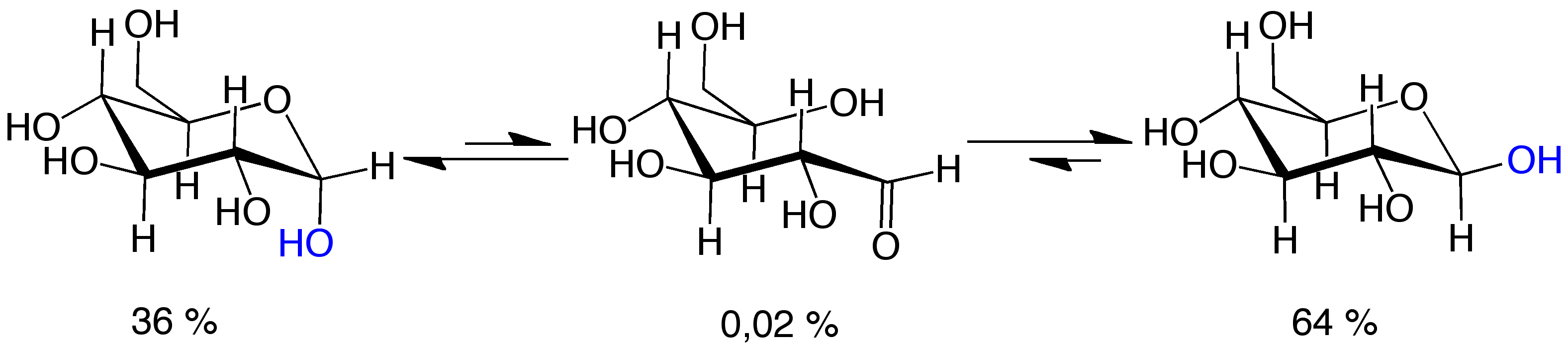 수용액에서 글루코스는 평형 상태로 존재하며, 다음 세 가지 구조가 일정 비율로 나타난다.물 속에서 평형 상태에 도달했을 때, 글루코스는 주로 α-글루코스(α-피라노스, 38%, 상단 그림 왼쪽)와 β-글루코스(β-피라노스, 62%, 상단 그림 오른쪽) 형태로 존재한다. 다른 이성질체 (푸라노스, 사슬 형태〈상단 그림 중앙〉)는 모두 합쳐도 1% 미만이다.[184] (아노머 효과 참조)