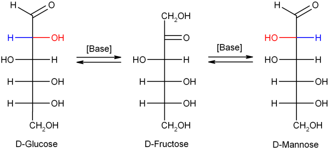 묽은 수산화 나트륨 또는 기타 묽은 염기에서 단당류인 만노스, 글루코스(포도당), 과당은 로브리 드 브로인-반 에켄슈타인 전환을 통해 서로 전환되며 이들 사이의 평형이 형성된다. 이 반응은 엔다이올을 통해 진행된다.