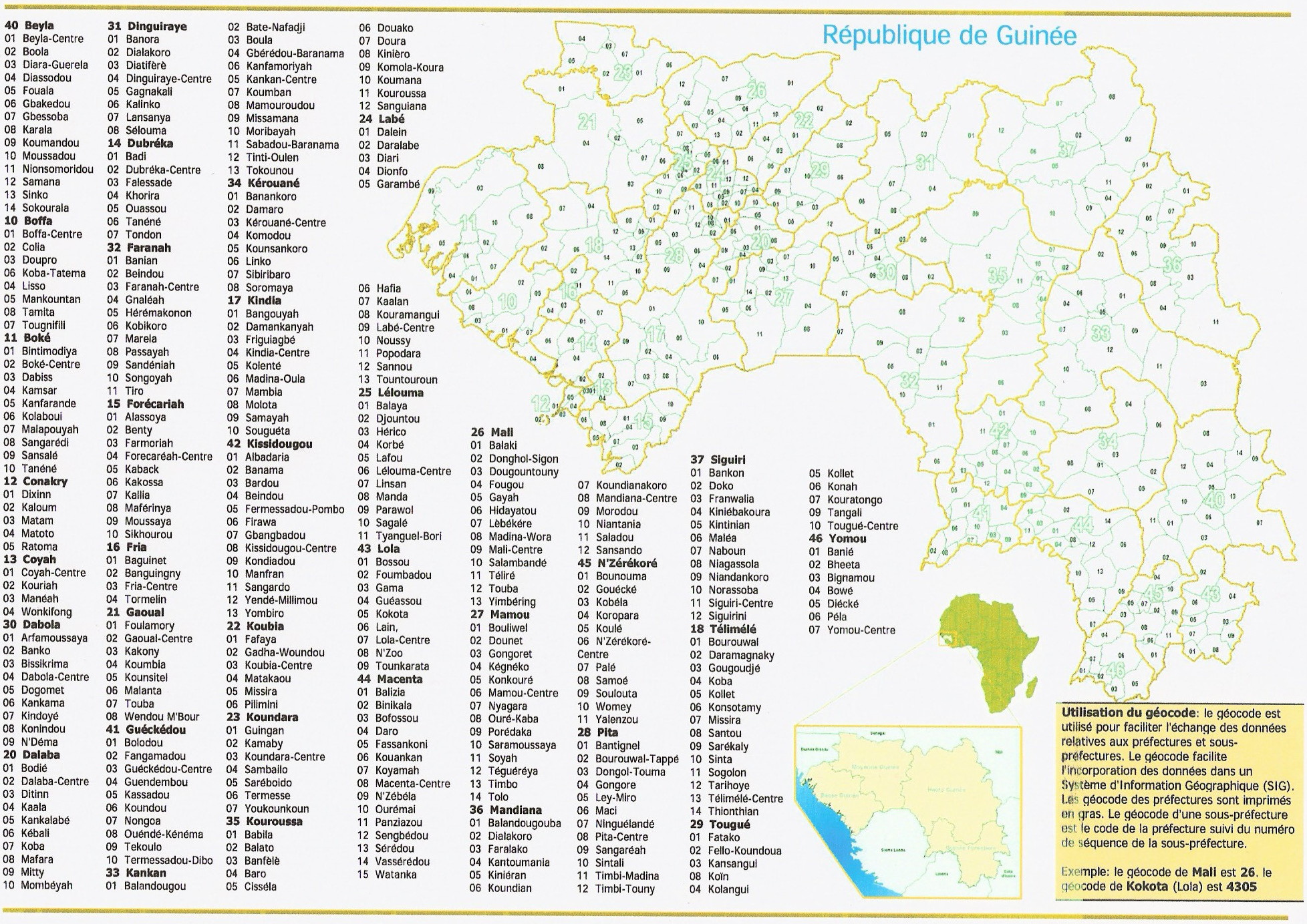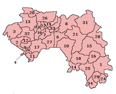 기니는 33개의 현(Prefecture)과 1개의 특별시 코나크리로 구성된다.