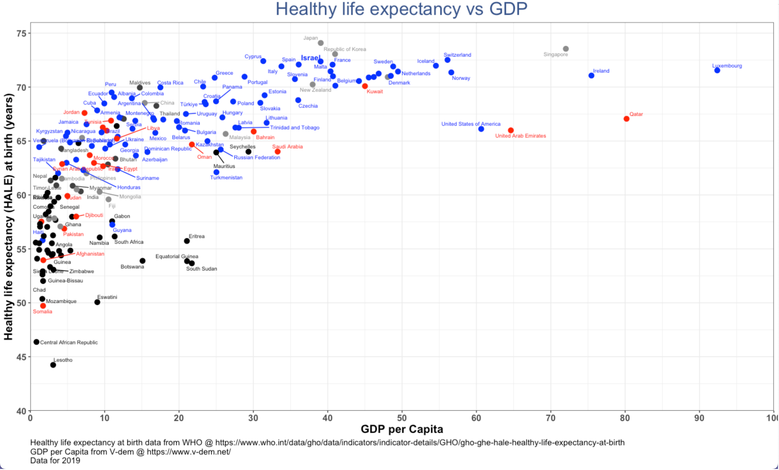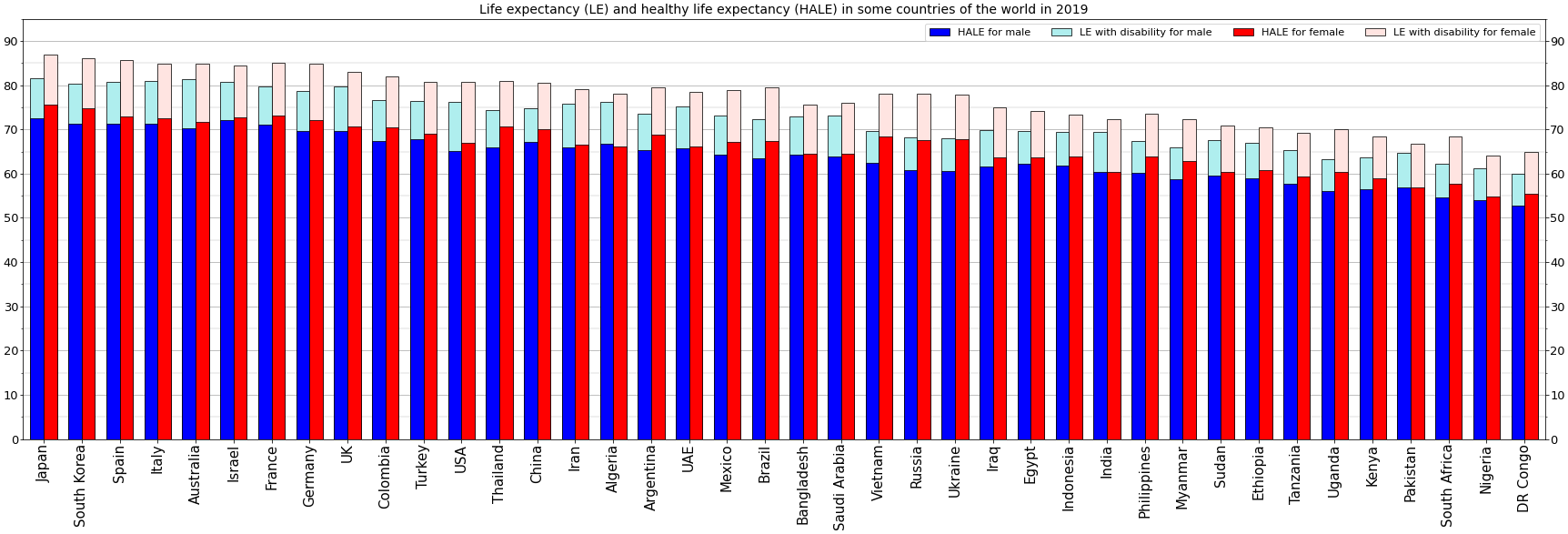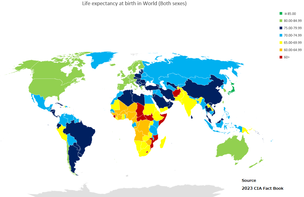 하지만 국가 간 기대수명 격차는 여전히 존재하며, 특히 최빈국의 기대수명은 전 세계 평균보다 7.4년 뒤쳐져 있다. 일본, 홍콩, 마카오는 2019년 기준 84세로 가장 높은 반면, 중앙 아프리카 공화국, 차드, 레소토, 나이지리아, 시에라리온은 55세 미만으로 가장 낮았다.