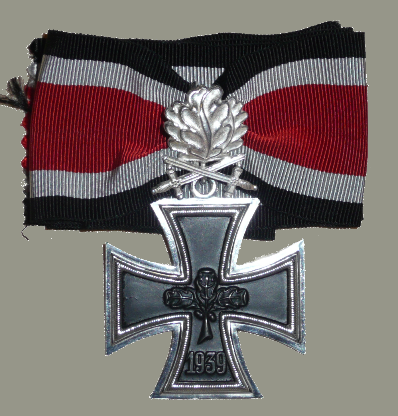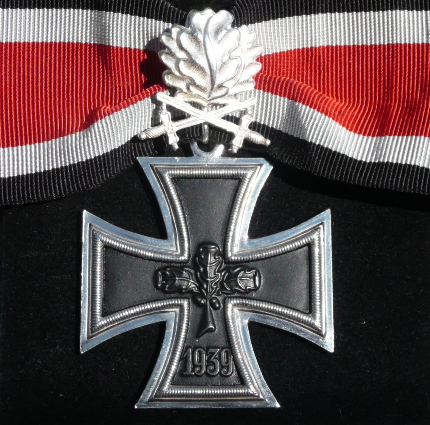 Ritterkreuz des Eisernen Kreuzes mit Eichenlaub und Schwertern|리터크로이츠 데스 아이제르넨 크로이체스 미트 아이헨라웁 운트 슈베르테른de은 1941년 9월 28일 제정되었다.[93] 백엽 기사십자 철십자장과 거의 같지만 백엽 밑에 교차된 검 한 쌍이 붙어있는 점이 다르다. 검의 길이는 24 밀리미터이다. 백엽과 검을 다 합친 길이는 가로 24.83 밀리미터, 세로 27.58 밀리미터이며 무게 9.03 그램이다.[94]