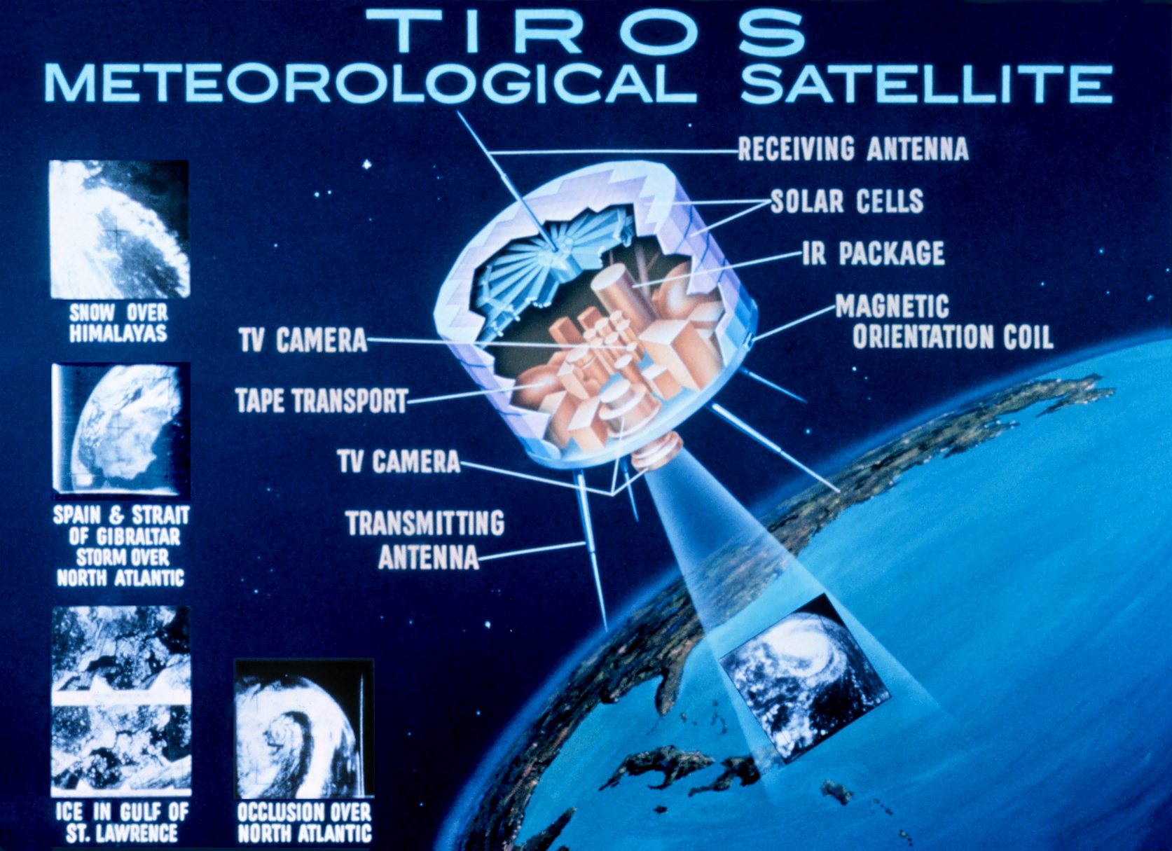 최초의 기상위성은 1960년 4월 1일에 발사된 티로스 1호이다. 가시광선 카메라를 탑재하여 낮에만 관측이 가능했고 수명은 78일로 짧았지만, 유익한 관측 데이터를 제공했다. 티로스 3호는 처음으로 허리케인을 촬영했고, 1964년 8월 님버스 1호(Nimbus I)는 극궤도에 발사되어 적외 방사계로 야간 구름 분포도 촬영할 수 있게 되었다. 1966년 2월, 최초의 현업용 기상위성 에싸 1호(Environmental Survey Satellite I)가 발사되어 매일 전 지구의 구름 분석이 시작되었다.[22]