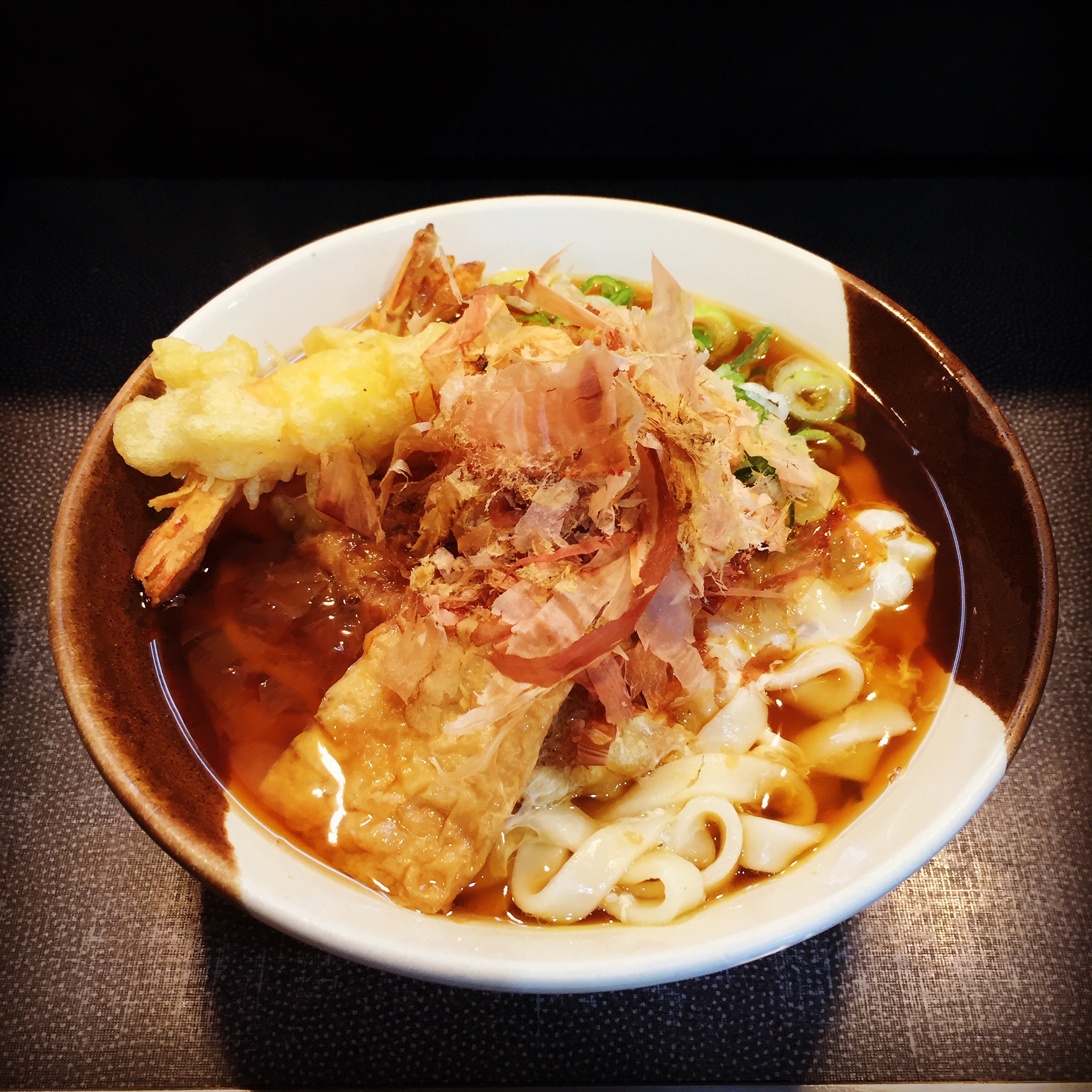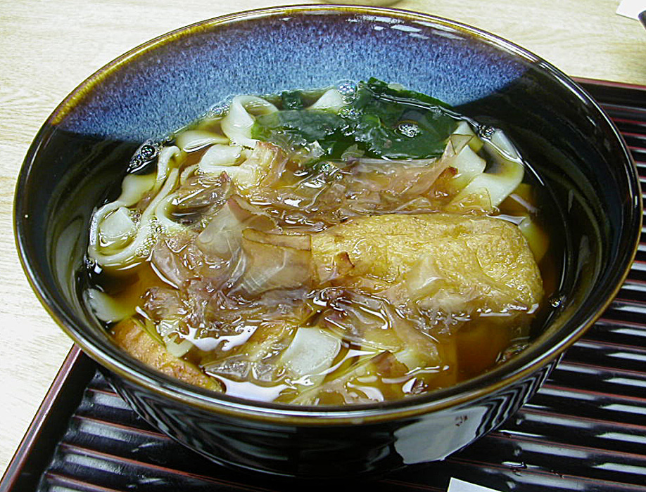 주요 재료 | 납작한 면, 유부, 가쓰오부시, 네기 |