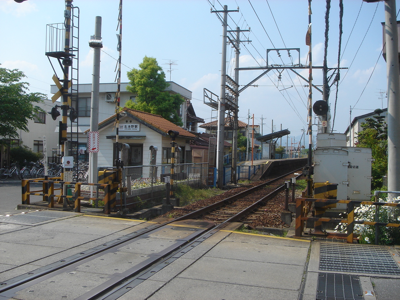 기타이케노 역 주변은 이케다정의 중심부에 위치하고 있다. 역 규모는 정 동쪽 입구에 해당하는 이케노역이 더 크며, 역사도 이케노 역이 더 오래되었다. 역 서쪽에는 이케다 산이 있지만, 역에서 다소 멀리 떨어져 있다.