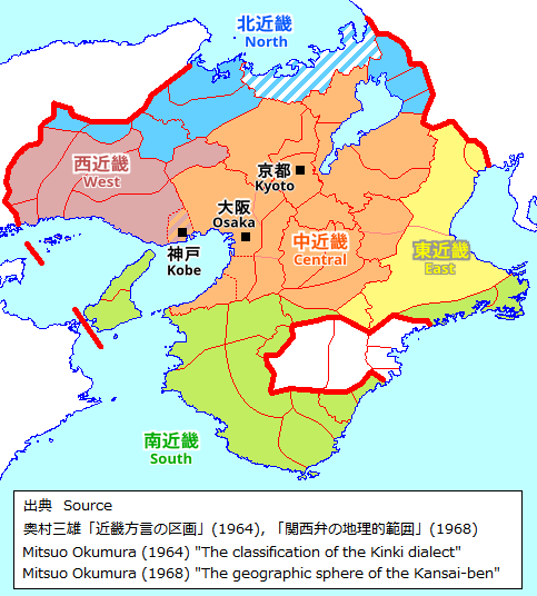 긴키 지방은 기나이 저지대(나라 분지, 오사카 평야, 교토 분지)를 중심으로 발전했으며, 중세 이후 교토, 근대 이후 오사카가 최대 도시가 되어 문화권을 형성하면서 언어적으로도 비교적 덩어리진 방언권이 형성되었다. 교토와 오사카의 방언을 합쳐 '''가미가타고'''(上方語)나 '''게이한고'''(京阪語)라고도 부른다.[96]긴키 방언 내에서의 방언 구획에는 다양한 안이 제창되었으나, 자연지리적・문화적 조건을 고려하여 게이한으로부터의 거리를 생각하고 구획되는 것이 많다(방언주권론).[96]