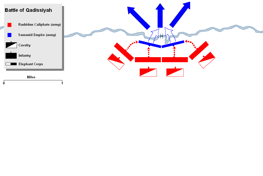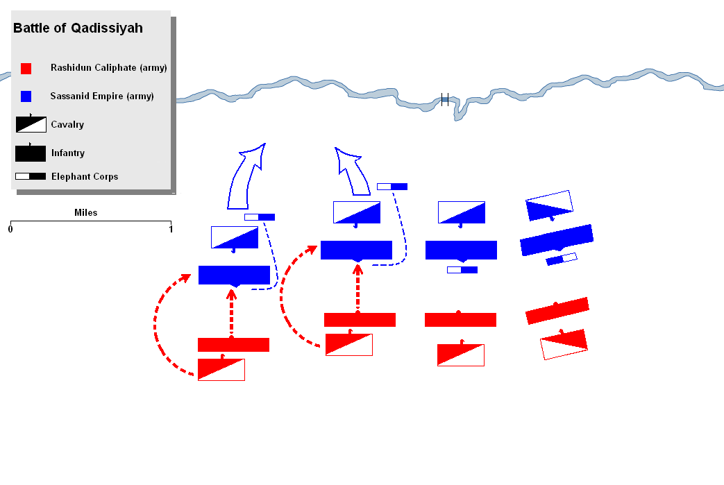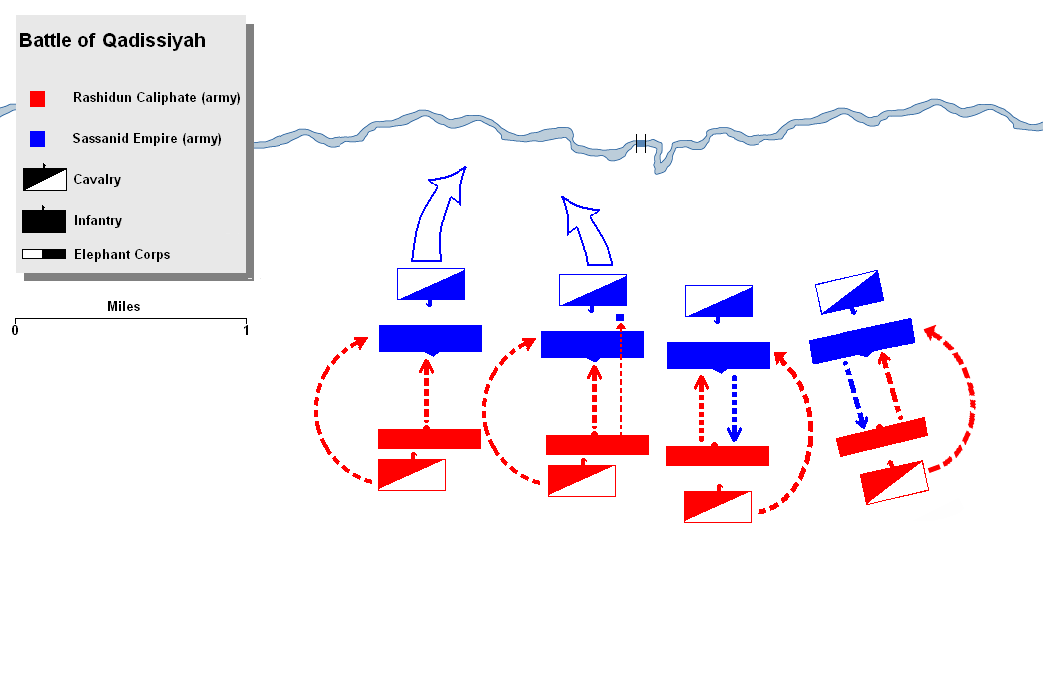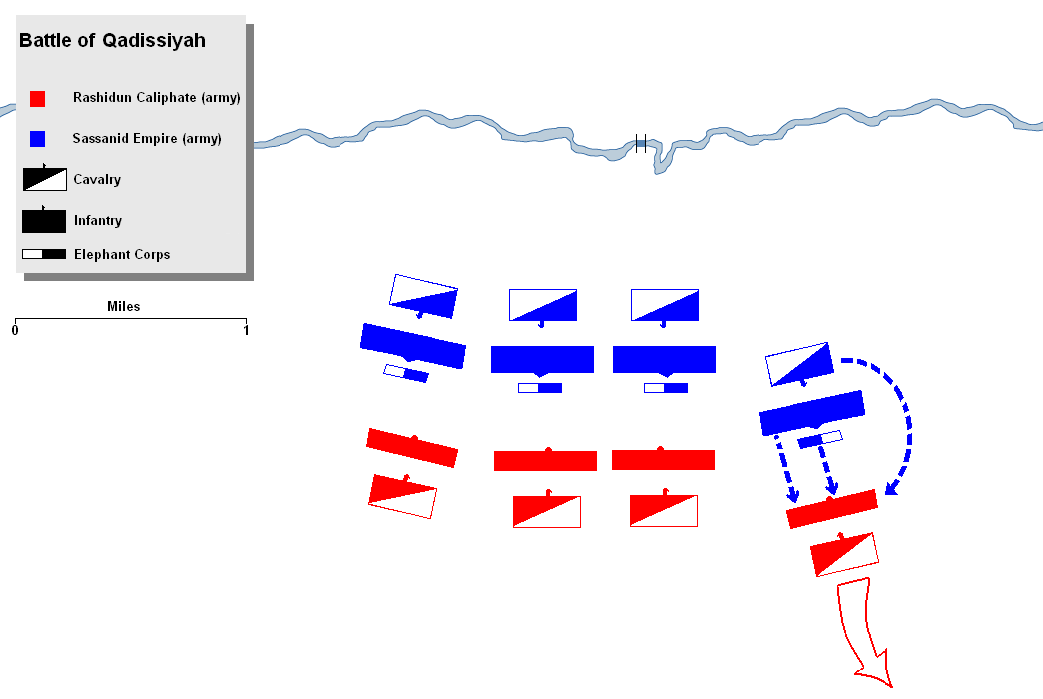 초반 공격이 실패하자 로스탐은 우익과 우익 중앙 군대에 무슬림 좌익과 좌익 중앙을 공격하도록 명령했다. 다시 한번 화살 공격에 이어 코끼리 부대가 돌격해오자, 무슬림 좌익 기병대는 혼란에 빠져 후퇴했다.