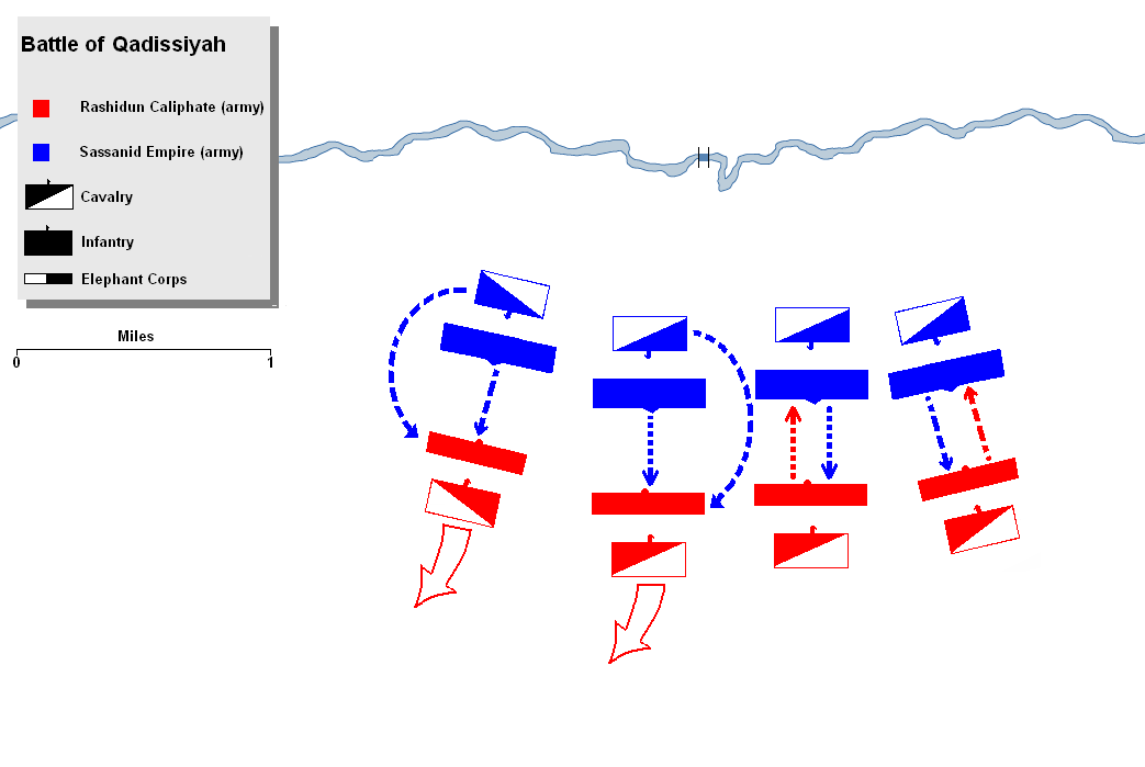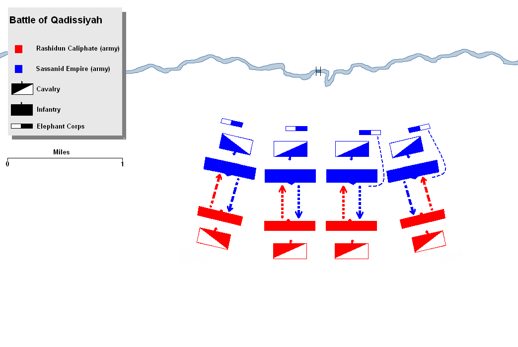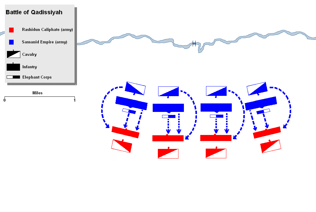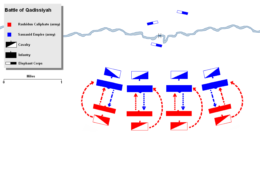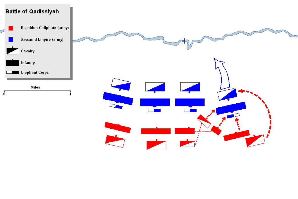 까디시야 전투에서 아랍 무슬림 군대는 사산 왕조 페르시아 군대에 결정적인 승리를 거두었다. 이 승리로 아랍군은 '데라프시 카비아니(카베의 깃발)'로 알려진, 보석으로 장식된 사산 왕조의 왕실 깃발을 포함한 막대한 전리품을 획득했다. 이 깃발에 박힌 보석들은 해체되어 메디나에서 팔렸다.[13] 전투에 참여한 아랍 전사들은 Ahl al-Qādisiyyah(까디시야의 사람들) 또는 Ahl al-Qawadis로 불리며 높은 명성을 얻었고, 이후 이라크와 쿠파 등 주요 도시에 정착한 아랍인들 사이에서 높은 지위를 누리게 되었다.