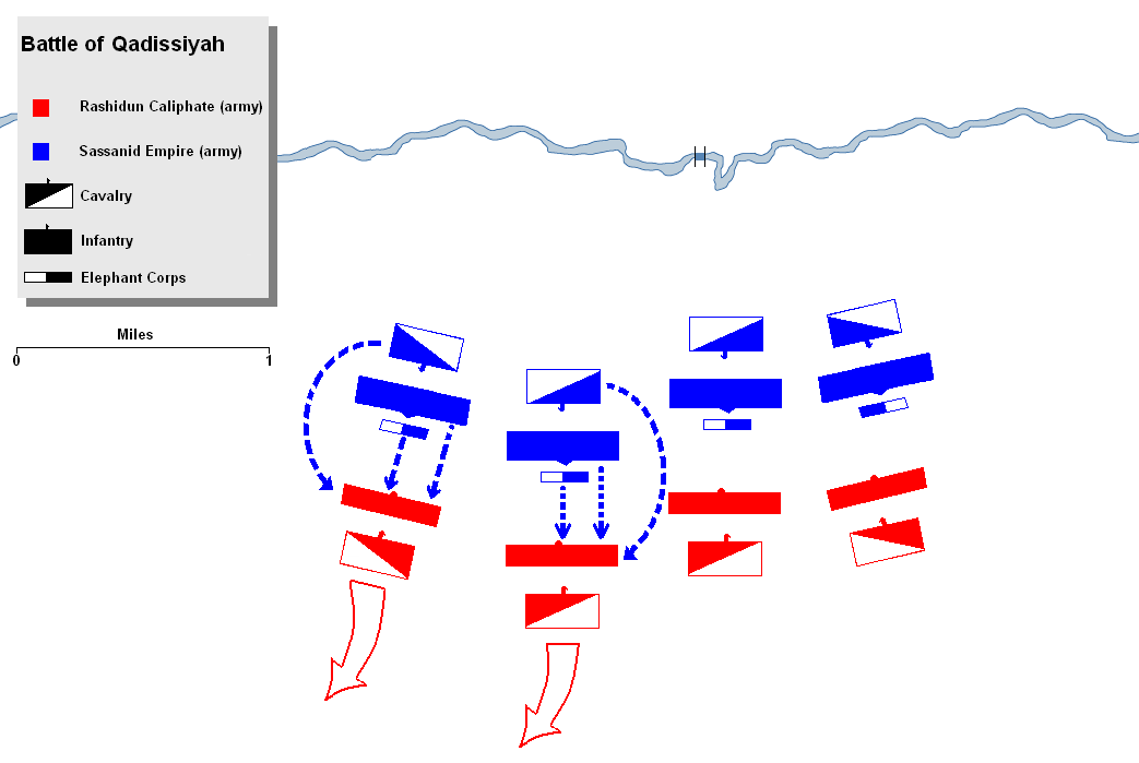 사드는 좌익 중앙 사령관 아심 이븐 암르에게 코끼리 부대를 제압하라고 지시했다. 아심은 궁수들에게 코끼리 위의 병사들을 저격하게 하고, 보병에게는 코끼리 안장의 끈을 끊게 하는 전술을 사용했다[6]。 이 전술이 성공하여 코끼리들이 물러나자 무슬림은 반격에 나섰고, 사산 우익과 우익 중앙 군대도 후퇴했다.