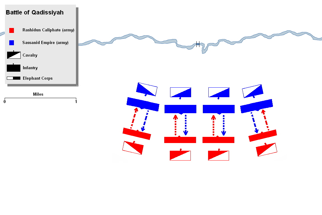 페르시아군의 공격은 강력한 화살 세례로 시작되었고, 코끼리 부대가 돌격을 이끌었다. 무슬림 우익 기병은 사산 중기병에게 저지당했고, 보병은 코끼리의 위세에 밀려 후퇴하기 시작했다.