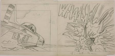 ''Whaam!''은 Irv Novick이 1962년 2월 DC 코믹스의 ''All-American Men of War'' 89호에 그린 "Star Jockey" 이야기의 한 패널을 차용했다.[22][23] 원본은 가상의 제2차 세계 대전 P-51 머스탱 조종사 조니 플라잉 클라우드, "나바호 에이스"가 제트 전투기를 조종하며 다른 제트기를 격추하는 모습을 예견하는 꿈 시퀀스의 일부이다.[24][25] 리히텐슈타인의 그림에서 공격기와 목표 비행기는 모두 다른 유형의 항공기로 대체되었다. Paul Gravett는 리히텐슈타인이 공격기를 다음 호(90호, 1962년 4월)에서 Jerry Grandenetti가 그린 "Wingmate of Doom"의 항공기로 대체했고,[73] 목표 비행기는 같은 89호의 "Aces Wild" 이야기 3페이지 3번째 패널의 Russ Heath[26] 그림에서 빌려온 것이라고 추측한다.[73] 또한 이 그림은 조종사가 "적은 불타는 별이 되었다!"라고 외치는 원본의 말풍선을 생략했다.[27]