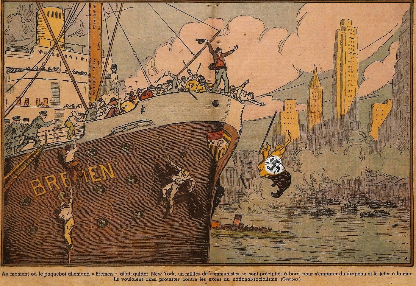 1935년 7월 26일, 미국 뉴욕 항에 정박 중이던 독일 객선 브레멘호에 게양된 하켄크로이츠 깃발이 반파시즘 활동가에 의해 허드슨 강에 버려지는 사건이 발생했다. 미국 정부는 하켄크로이츠 깃발이 공식 국기가 아니라는 이유로 독일 대사의 항의를 무시했다.[19]