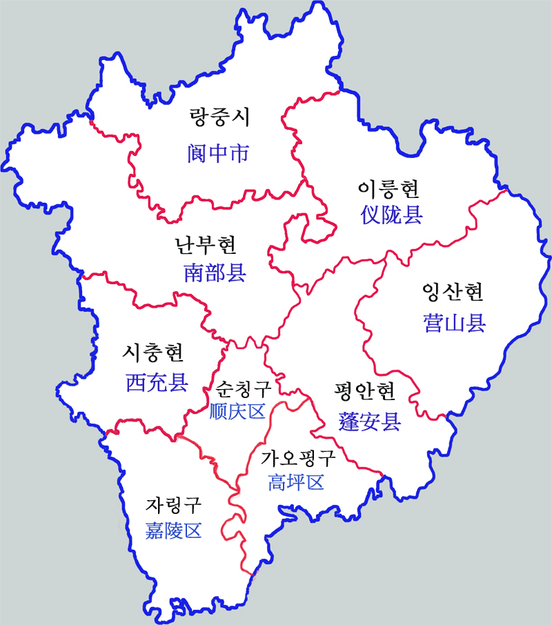 1953년 3월 10일 | 대죽전구(大竹専区) 광안현(広安県), 광원전구(広元専区) 창계현(蒼渓県)・낭중현(閬中県) 편입 (1시 11현) |
