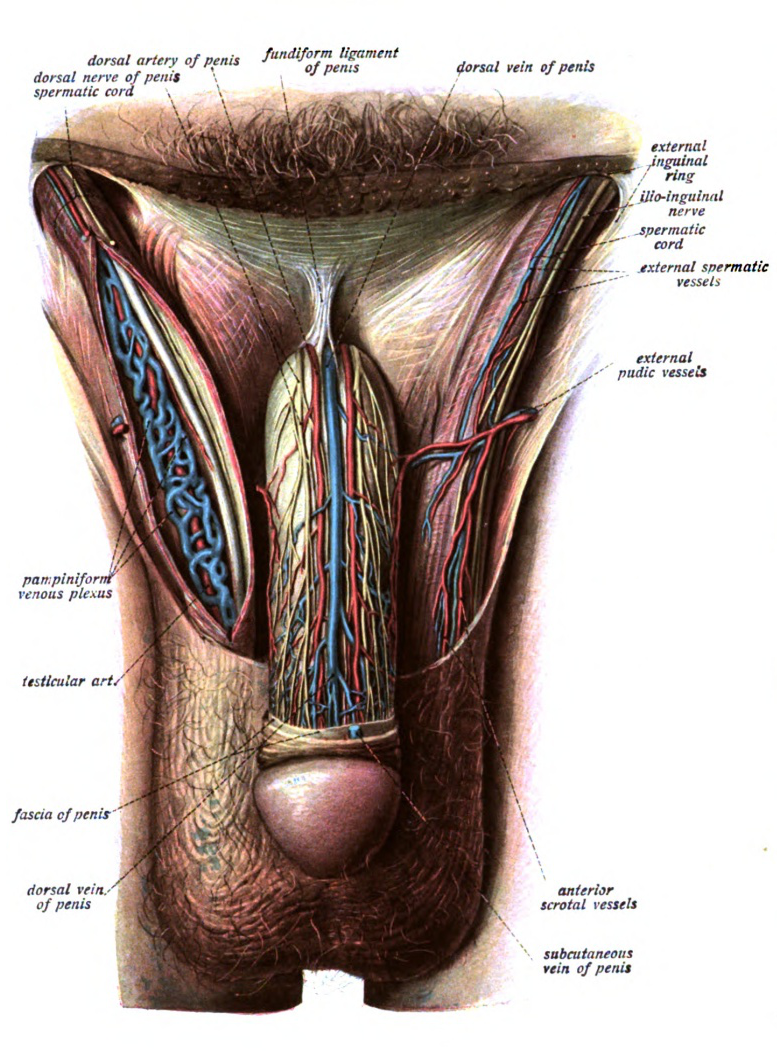 남성의 생식 기관은 음경, 고환, 부고환, 정관, 사정관, 전립선, 정낭, 요도, 음낭 등으로 구성된다.[22] 이들은 남성 호르몬 생성 및 분비, 성교, 배뇨 등의 중요한 기능을 수행한다.[21] 특히, 고환은 정자를 생성하고, 전립선은 정액의 일부를 분비하여 생식에 중요한 역할을 담당한다. 음낭은 고환을 보호하며, 음경은 배뇨와 사정 기능을 함께 수행하는 기관이다.[21] 이처럼 남성 생식 기관은 복잡하고 정교한 구조와 기능을 통해 남성의 생식 능력을 유지하고 건강에 기여한다.