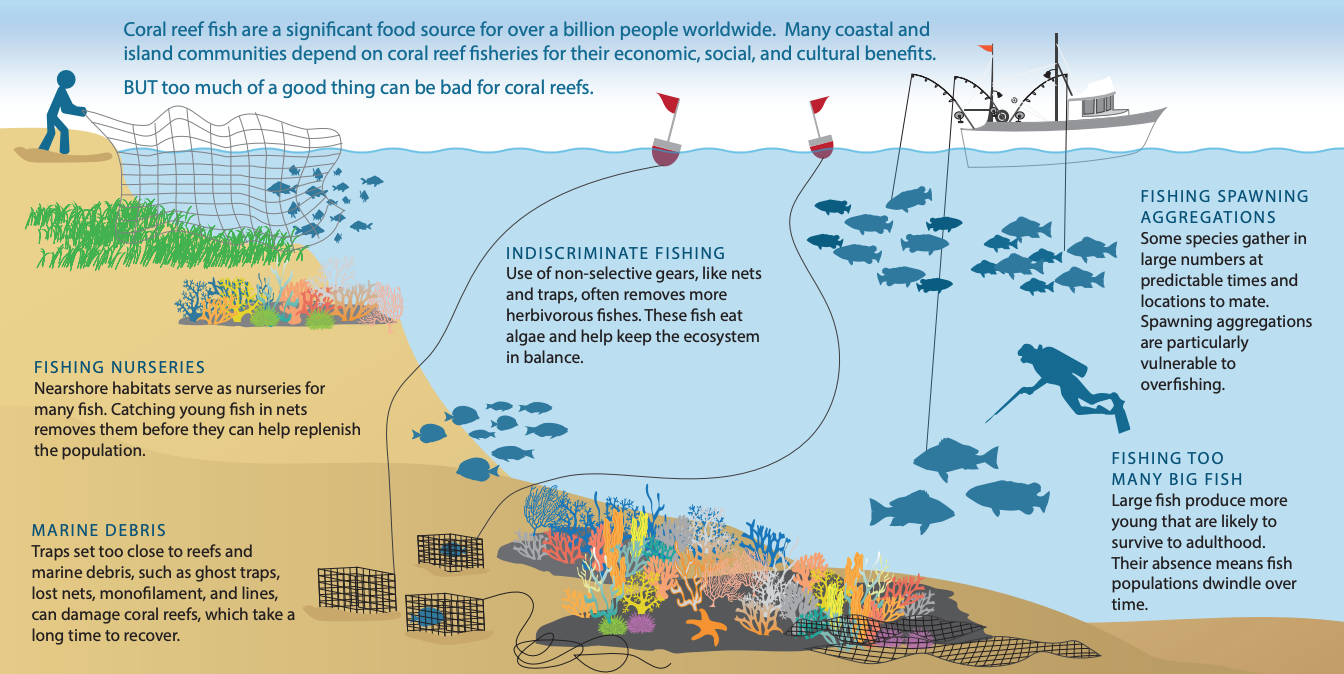 어획량을 줄이는 것은 남획이 발생할 때 일어나는 일이다. 모든 큰 물고기가 잡히면 어부는 작은 개체를 낚기 시작하여 수요를 따라잡기 위해 더 많은 물고기를 잡아야 한다.[10] 이는 질병에 더 취약하고 스트레스 요인과 환경에 적응할 가능성이 낮아지면서 물고기 개체군과 종의 유전적 다양성을 감소시킨다.[11] 또한, 작은 물고기를 잡는 것은 더 작은 자손의 번식으로 이어지며, 이는 물고기에게 문제가 될 수 있다. 많은 종에서 암컷이 작을수록 포란이 적어져 물고기 개체군에 영향을 미친다.[12]
