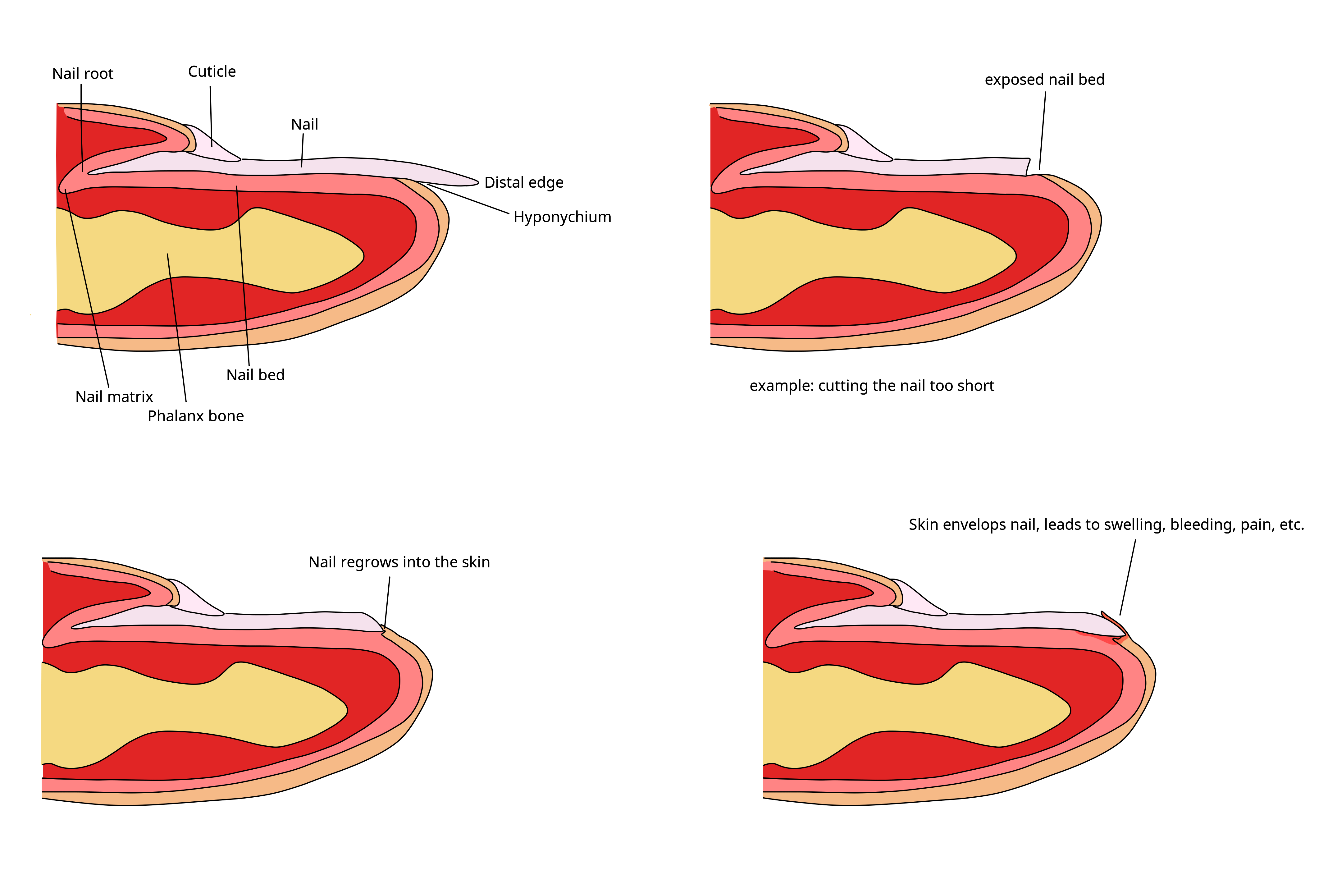 손발톱의 가장자리를 너무 짧게 깎으면 통증이 발생하고, 이를 완화하기 위해 더욱 짧게 깎는 악순환이 반복될 수 있다.[24]