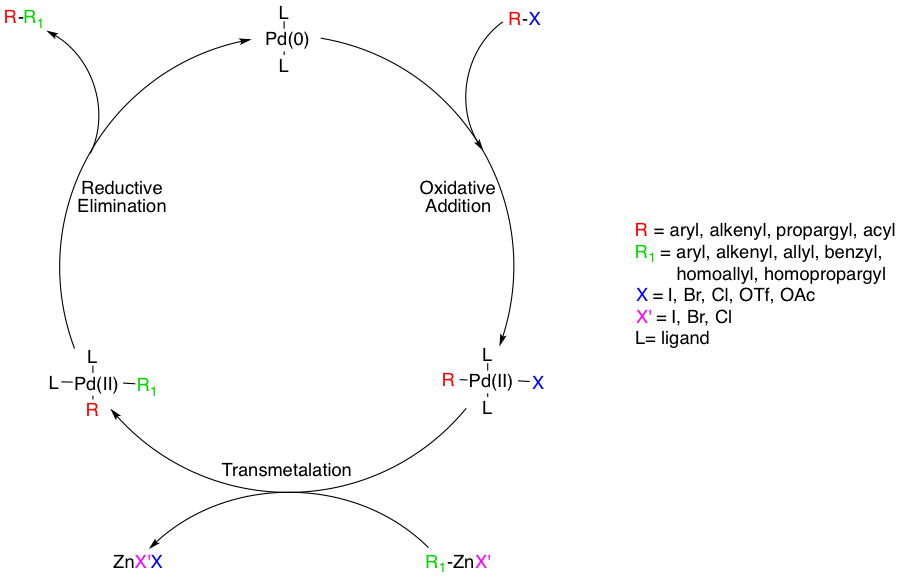 다음으로, 전이 금속화 단계가 발생하여 유기 아연 시약이 Pd(II) 복합체의 할라이드와 유기 치환체를 교환하여 트랜스 Pd(II) 복합체와 아연 할라이드 염을 생성한다. 유기 아연 기질은 아릴, 비닐, 알릴, 벤질, 호모알릴 또는 호모프로파길일 수 있다.[8] 전이 금속화는 일반적으로 속도 제한 단계이며, 이 단계에 대한 완전한 메커니즘적 이해는 아직 이루어지지 않았지만, 여러 연구를 통해 이 과정에 대한 단서가 제시되었다. 알킬아연 종은 전이 금속화 전에 고차 아연산염 종을 형성하는 반면, 아릴아연 종은 그렇지 않다.[11] ZnXR과 ZnR2는 모두 반응성 시약으로 사용할 수 있으며, Zn은 네 개의 배위 복합체를 선호하는 것으로 알려져 있다.[12] 연구에 따르면 시스 및 트랜스 비스 알킬 유기 팔라듐 복합체 간에 경쟁적 평형이 존재하지만, 유일한 생산적인 중간체는 시스 복합체이다.[13][14]