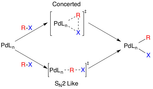 산화 첨가의 실제 메커니즘은 해결되지 않았지만, 두 가지 가능한 경로가 있다. 한 경로는 SN2 유사 메커니즘을 통해 진행되어 입체 화학이 반전되는 것으로 생각된다. 다른 경로는 협동 반응을 통해 진행되며 입체 화학을 유지한다.