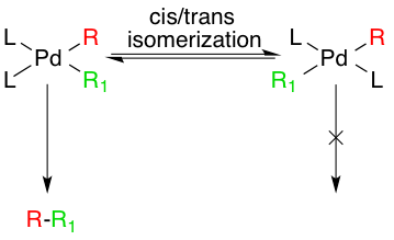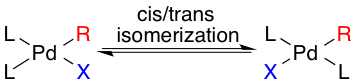 첨가는 시스 형태이지만, Pd(II) 복합체는 빠르게 트랜스 형태로 이성질화된다.[10]