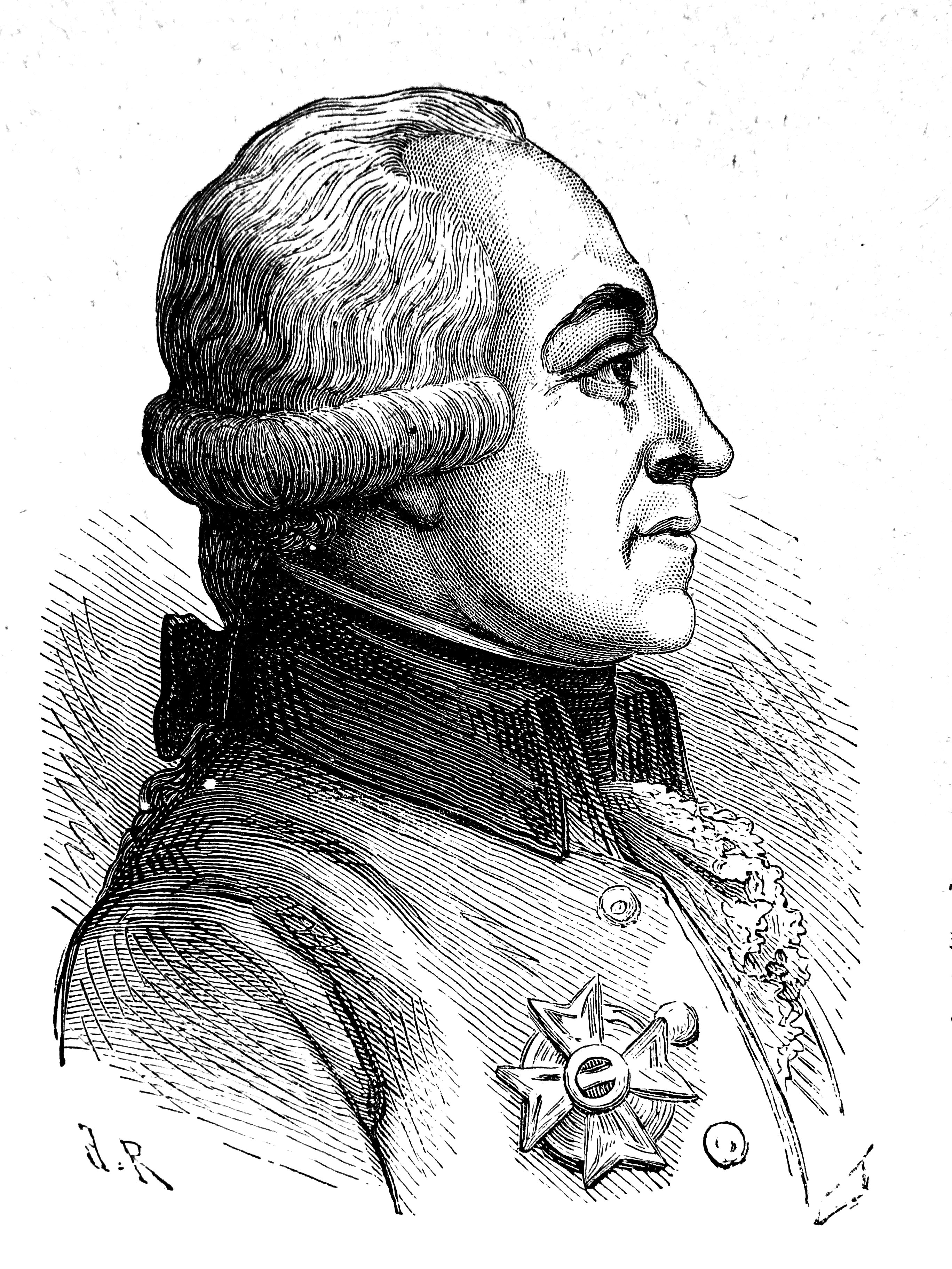 검은 눈썹에 묶어 뒤로 넘긴 흰머리를 가진 남자의 그림. 그는 어두운 파란색 군복을 입고 있으며 나폴레옹 스타일로 단추 사이에 오른손을 넣고 있다.
