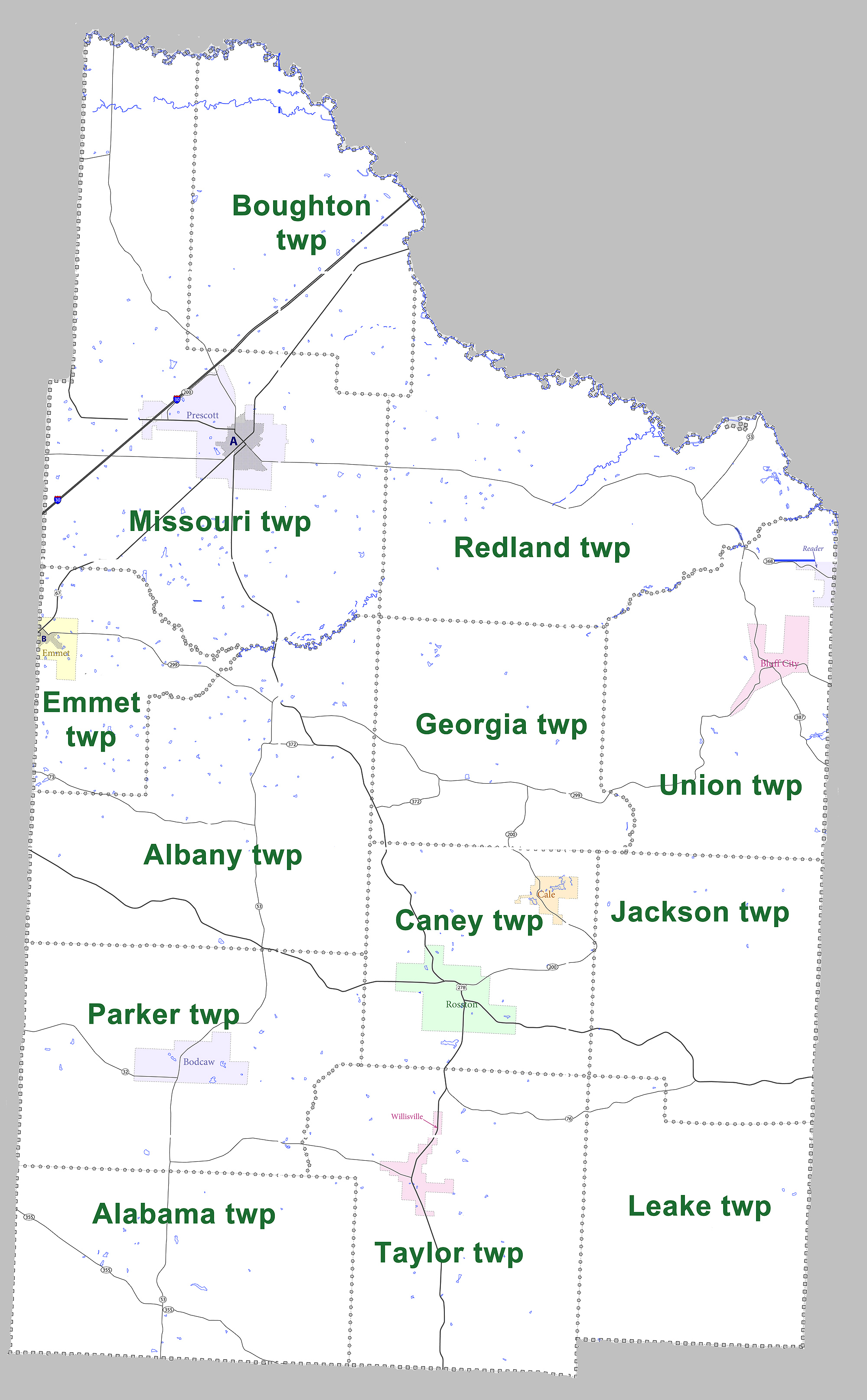 이 지역은 역사적으로 카도 연맹 구성원들이 거주했으며, 그들의 영토는 현재의 텍사스와 루이지애나까지 뻗어 있었다. 카도족은 수로를 따라 정착하여 교통과 어업에 이용했다. 식민지 시대의 프랑스인과 이후 유럽계 미국인 정착민들 또한 수로를 따라 토지를 차지했으며, 이는 19세기까지 그들의 기본적인 교통로였다. 20세기 초 의회가 금주법을 폐지한 후, 네바다 군은 이를 유지하기로 투표했으며, 여전히 "금주 지역"이다.
