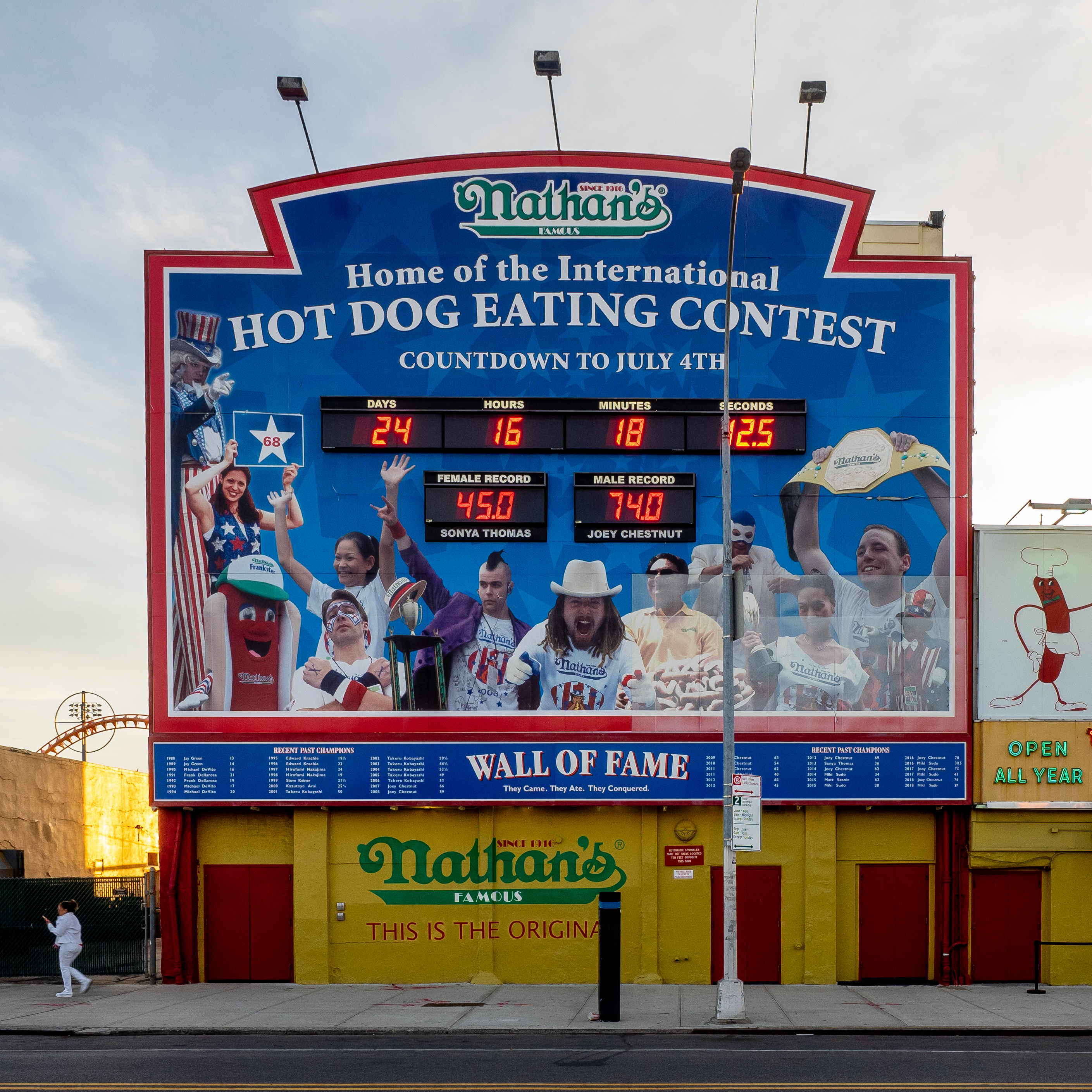 네이선스 핫도그 먹기 대회는 1970년대 초부터 매년 7월 4일 코니아일랜드의 원래 장소에서 개최되었다.[23] 참가자들은 10분 안에 가능한 한 많은 핫도그를 먹으려고 시도한다. 우승자로는 고바야시 타케루 (2001–2006), 조이 체스넛 (2007–2014, 2016–2023)과 미키 수도 (여성 부문 2014–2018)가 있다.[24] 2008년, 체스넛은 10분 만에 핫도그와 빵 59개를 먹고 고바야시와 동점을 기록했다. 이 동점은 핫도그 5개 먹기 대결로 이어졌고, 체스넛이 고바야시보다 먼저 5개를 모두 먹어 승리했다.[25] 2018년, 체스넛은 핫도그와 빵 74개를 먹어 새로운 세계 기록을 세웠다.[26]