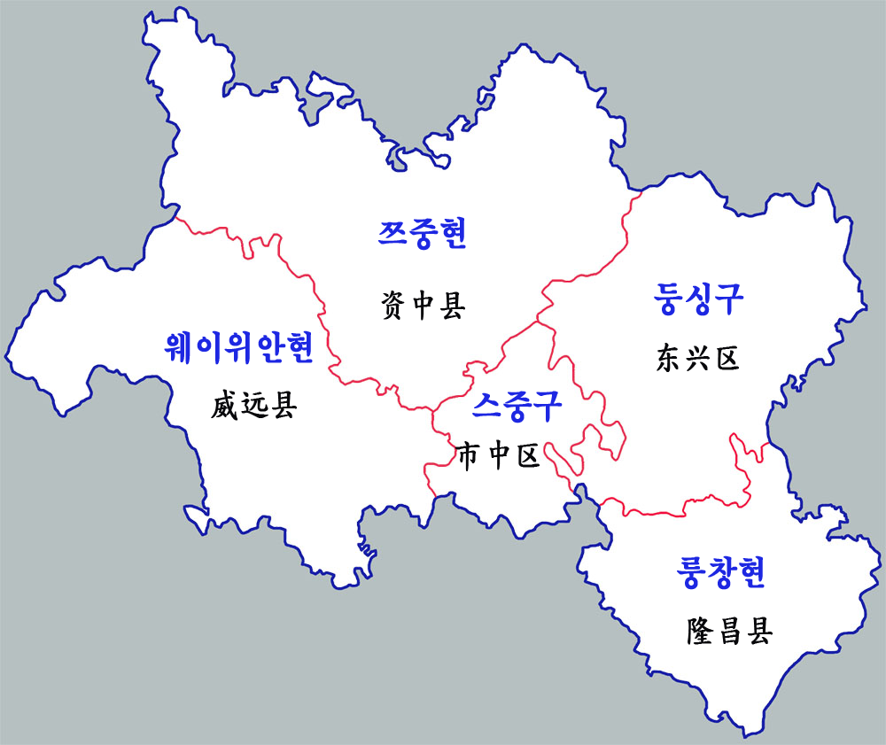 쓰촨 분지 중남부의 구릉 지대에 위치하며, 북서쪽이 높고 남동쪽이 낮다. 타강이 시역을 관통하여 수량이 풍부하다. 동쪽은 충칭시, 서쪽은 메이산시, 남쪽은 쯔궁시와 루저우시, 북쪽은 쯔양시와 접한다.