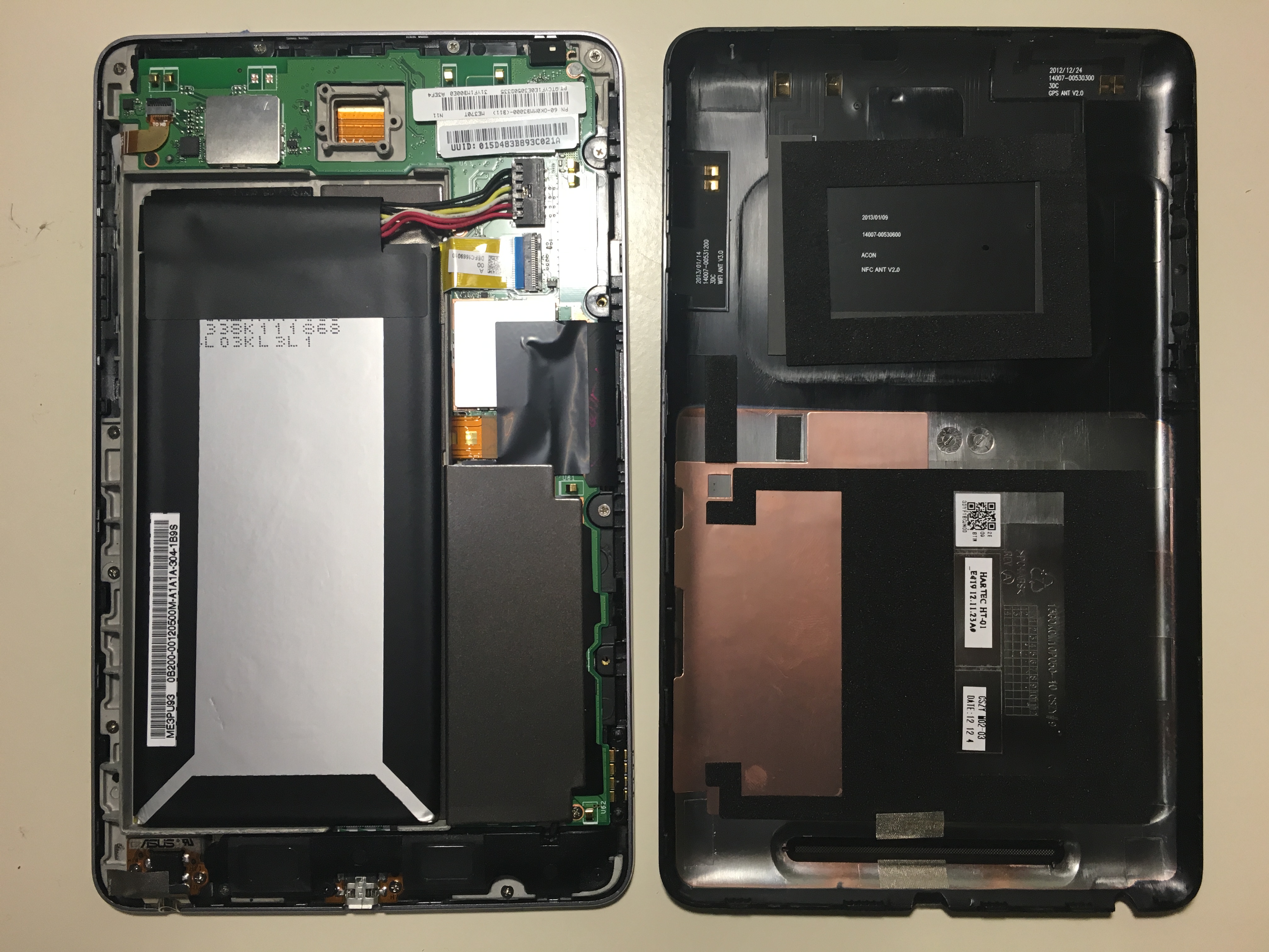 넥서스 7(ASUS-1B32)은 플라스틱 섀시를 채택했으며, 크기는 길이 198.5mm, 너비 120mm, 두께 10.5mm이다. 무게는 340g이다. 1.3 GHz Cortex-A9 쿼드 코어 중앙 처리 장치(CPU)와 416 MHz 12코어 Nvidia GeForce ULP 그래픽 처리 장치(GPU)로 구성된 Nvidia Tegra 3 SoC를 탑재했다.[56][57] 가속도계와 자이로스코프가 내장되어 있어, 그래픽을 많이 사용하는 게임 플레이를 지원한다.[56][57] Tegra 3 프로세서는 4개의 기본 코어 외에, 프로세서 요구량이 적을 때 배터리 수명을 늘려주는 "스텔스" 코어를 포함한 "가변 대칭 멀티프로세싱"을 특징으로 한다.[10][58]