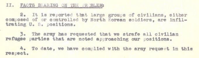 2000년 6월, CBS 뉴스는 1950년 7월의 미국 공군 메모를 보도했는데, 여기에는 한국 작전 책임자가 공군이 미군 진지에 접근하는 난민 대열을 기관총 공격하고 있다고 밝혔다.[46][47] 7월 25일에 작성된 이 메모는 미 육군이 민간인에 대한 공격을 요청했으며 "현재까지 우리는 육군의 요청에 따라 행동해 왔다"고 밝혔다.[48] 이후 공개된 미 해군 문서에는 항공모함 조종사들이 육군이 한국에서 8명 이상의 그룹을 공격하라고 말했다고 보고했다는 내용이 담겨있다.[1][49] 한국 학자 김태우는 1950년 공군 임무 보고서를 검토한 후 "대부분의 전투기 폭격기 조종사들은 흰 옷을 입은 한국 민간인을 적군으로 간주했다"라고 결론 내렸다.[48]