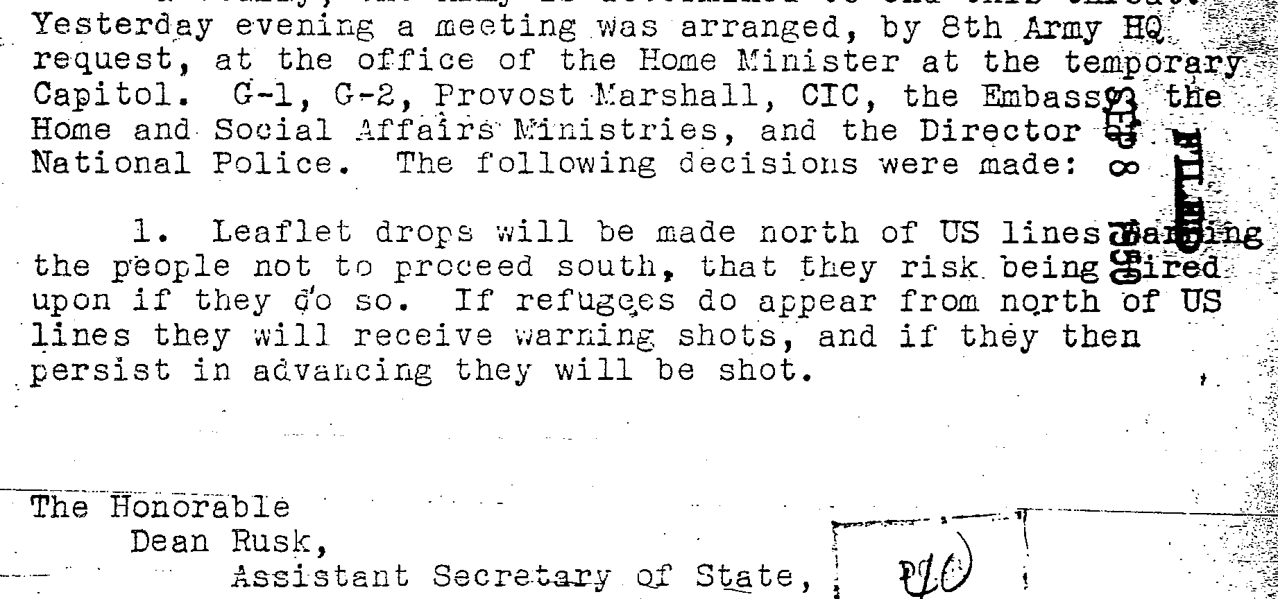 AP는 미국 국립 문서 보관소에서 공개된 군사 문서를 조사하여 1950년 7월 말 최전선 부대가 진지에 접근하는 한국 난민을 사살하라는 지시가 기록되어 있음을 발견했다.[43] 제8기병연대의 연락 장교는 제1기병사단 본부로부터 미군 전선을 넘으려는 난민에게 사격을 가하라는 지시를 그의 부대에 전달했다. 인접한 제25보병사단의 윌리엄 B. 킨 소장은 경찰이 제거해야 할 지역에서 발견된 모든 민간인을 적으로 간주하고 "그에 따라 처리"해야 한다고 조언했으며, 그의 참모들은 이 명령을 "비우호적으로 간주하고 사살한다"고 전달했다.[43] 제8군은 노근리 학살이 시작된 날, 모든 부대에 난민의 선 통과를 막으라고 명령했다.[17][44]