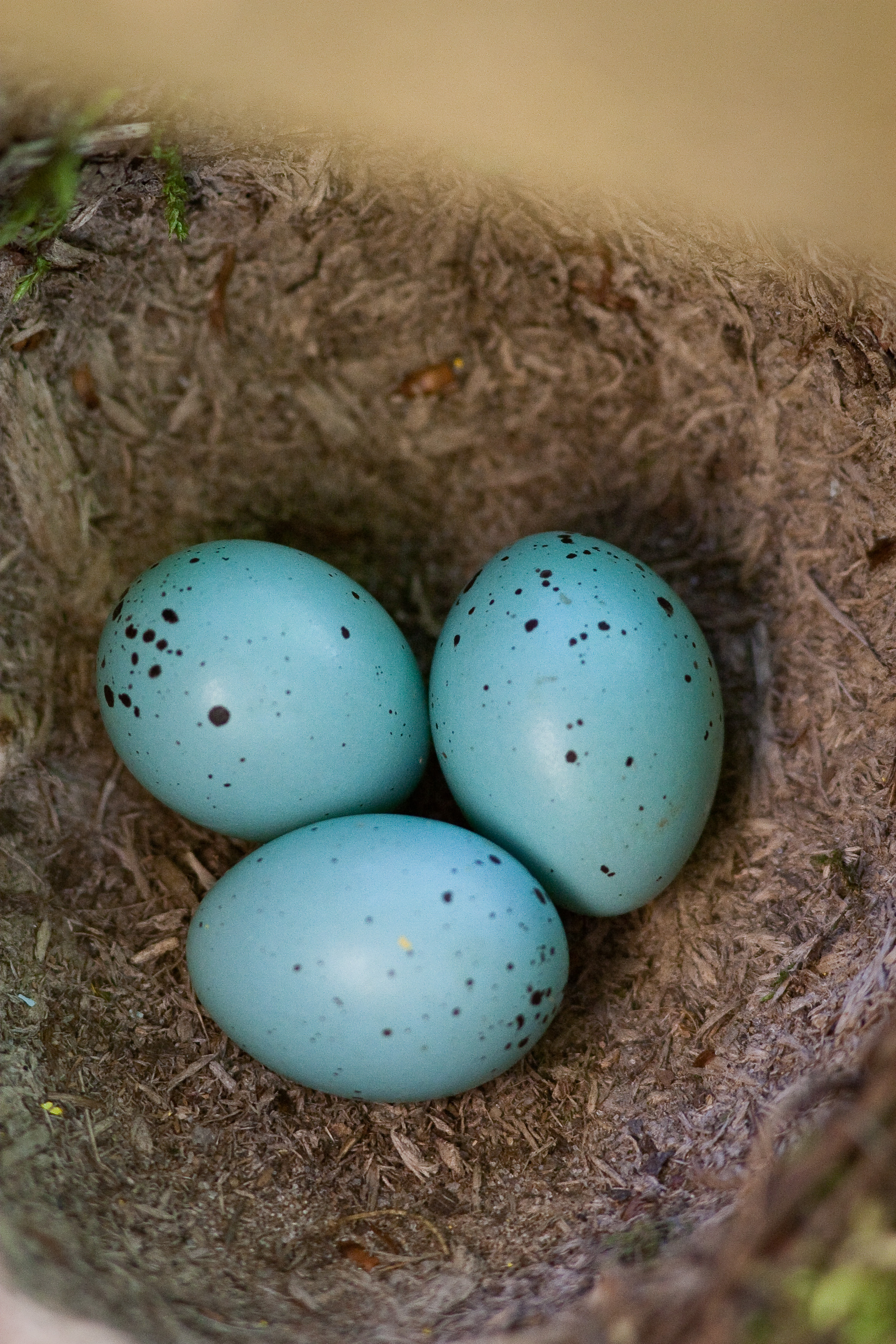 암컷은 덤불, 나무, 덩굴 식물에 진흙과 마른 풀을 가지고 컵 모양의 둥지를 짓는다. 헤브리디스 제도 아종의 경우에는 땅에 둥지를 짓기도 한다. 빛나는 파란 알을 4~5개 낳으며, 알에는 검거나 자주색을 띄는 약간의 점들이 있다.[53] 알의 크기는 보통 2.7cm x 2cm이며, 무게는 6g이고 그 중 6%가 껍데기이다.[55]