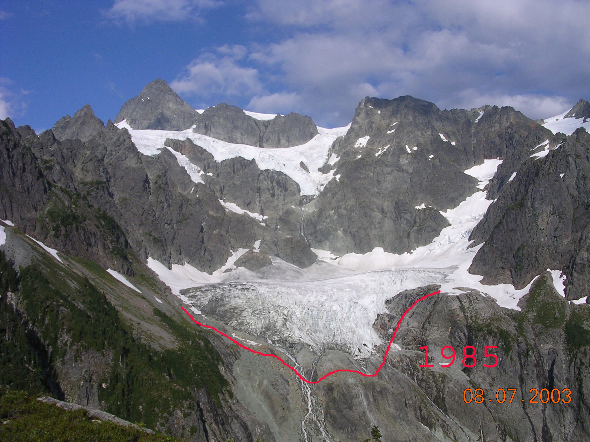 노스캐스케이드 국립공원 내 117km2 지역에 318개의 빙하가 있다(Post et al. 1971). 이는 워싱턴주 이남의 49개 주 어떤 국립공원보다 많은 숫자이다. 공원 내 전체 빙하는 1980년부터 2005년까지 현저하게 후퇴했으며, 후퇴 속도는 빨라지고 있다. 최근의 기후 온난화로 인해 여름에 더 많은 얼음이 녹고, 겨울에도 녹는 현상이 증가했으며, 겨울의 적설량이 줄어들고 있다. 캐스케이드 산맥의 일부 빙하는 최근 10년 동안 녹아 없어졌다.빙하 연구 자료 보스턴 피크 북쪽 사면에 있는 보스턴 빙하는 면적 7km2로, 공원 내에서 가장 큰 빙하다. 그 외의 큰 빙하(2.5km2보다 큰 것)는 다음과 같다.