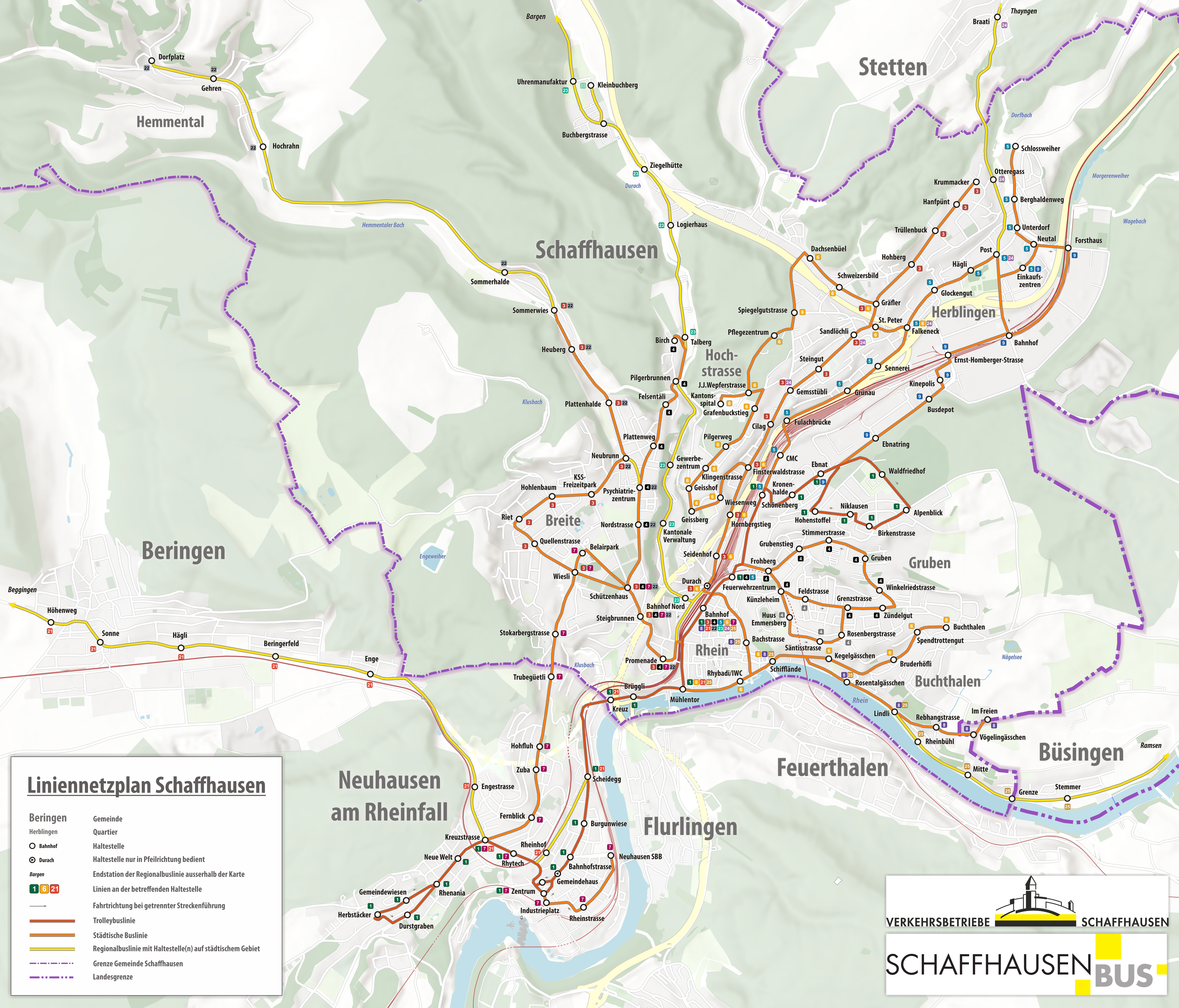 1 | 헤르브스테커 – 게마인데비젠/두르스트그라벤 – 레나니아 – 노이에 벨트 – 크로이츠슈트라세 – 라이테크 – 노이하우젠 첸트룸 – 게마인데하우스 – 반호프슈트라세 – 부르군비제 – 샤이데크 – 크로이츠 – 샤프하우젠역 – 에브나트 – 발트프리트호프 |