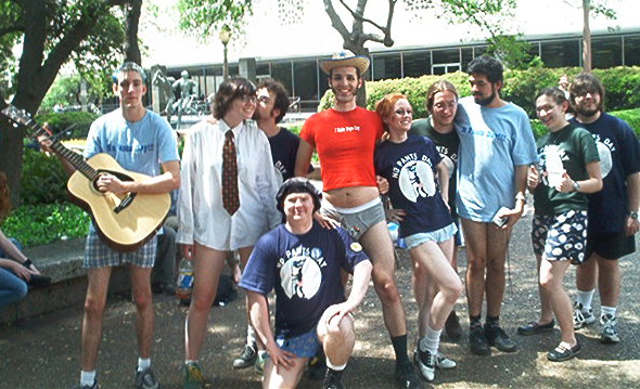 노팬츠 데이는 텍사스 대학교 오스틴 학생들을 위한 비공식적인 학기 말 기념 행사로 시작되어, 다른 지역 및 해외로 확산되었다.