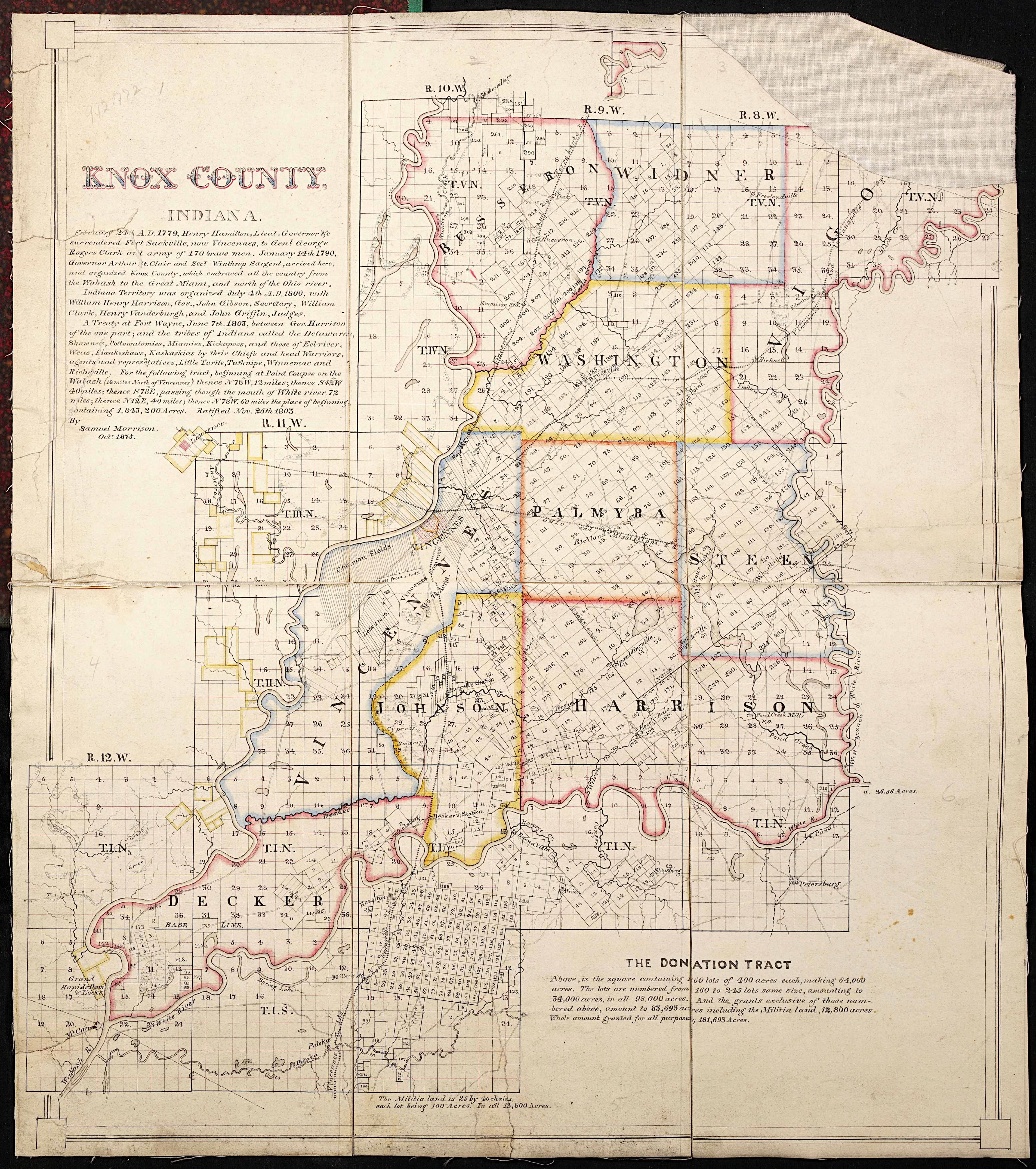 1790년, 노스웨스트 준주비서인 윈스럽 사전트가 녹스군 (인디애나주)을 조직했는데, 이는 노스웨스트 준주에서 네 번째로 조직된 군이었다.[3] 군의 이름은 미국 독립 전쟁 영웅이자 초대 미국 전쟁부 장관을 역임한 헨리 녹스 소장의 이름을 따서 명명되었다.[3] 인디애나 준주가 설립되기 전, 녹스군은 북쪽으로 캐나다까지 뻗어 있었으며, 현재의 인디애나주, 미시간주, 일리노이주, 오하이오주의 전체 또는 일부를 포함했다.[3] 1809년 일리노이 준주가 설립되면서 와바시 강 너머의 녹스군 지역은 세인트클레어군이 되었다.[3]