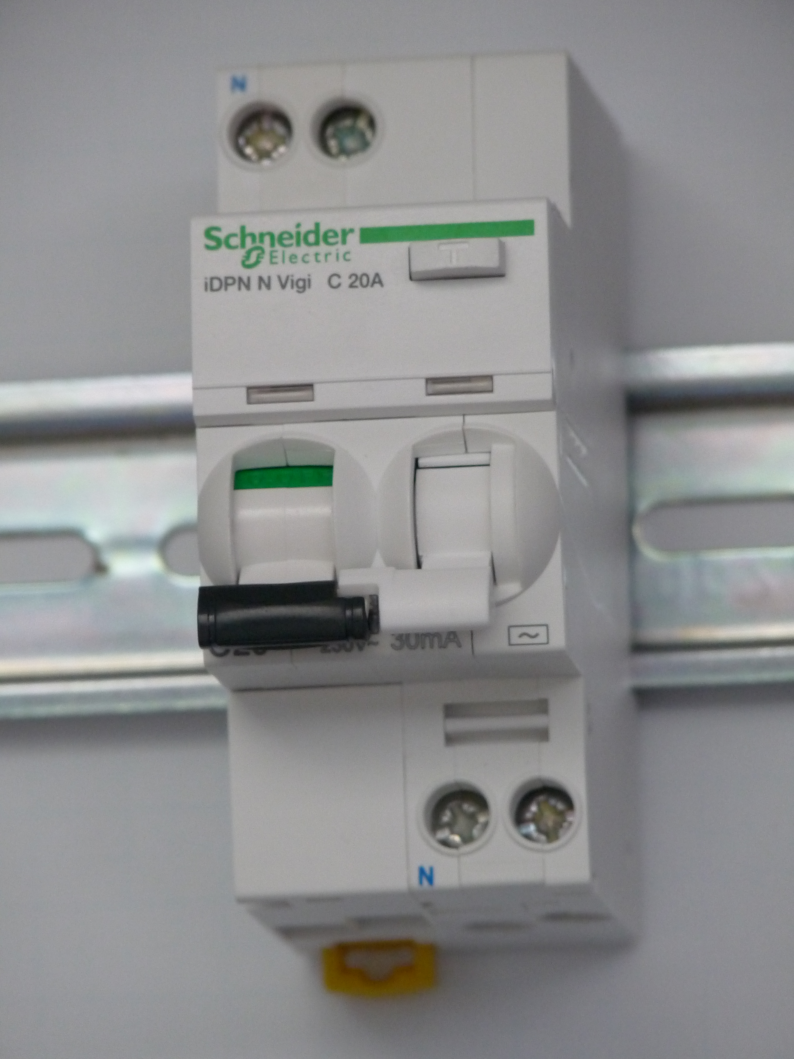 유럽에서는 RCD가 소형 회로 차단기와 동일한 DIN 레일에 장착될 수 있으며, 분전반 및 배전반의 버스바 배열은 다운스트림의 모든 것을 보호한다.