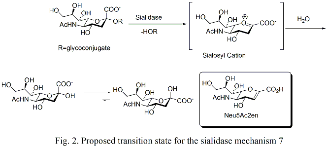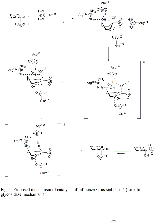 인플루엔자 바이러스 시알리데이즈(뉴라미니데이스)의 효소 메커니즘은 Taylor et al.에 의해 연구되었으며, 아래 그림과 같다. 효소 촉매 작용 과정은 4단계로 이루어진다. 첫 번째 단계는 시알로사이드가 시알리데이즈에 결합할 때 α-시알로사이드가 2C5 의자 형태(용액에서 가장 낮은 에너지 형태)에서 유사 보트 형태로 변형되는 것을 포함한다. 두 번째 단계는 옥소카보양이온 중간체인 시알로실 양이온으로 이어진다. 세 번째 단계는 Neu5Ac가 처음에는 α-이성질체로 형성된 다음, 뮤타로테이션을 거쳐 열역학적으로 더 안정적인 β-Neu5Ac로 방출되는 것이다.[12]
