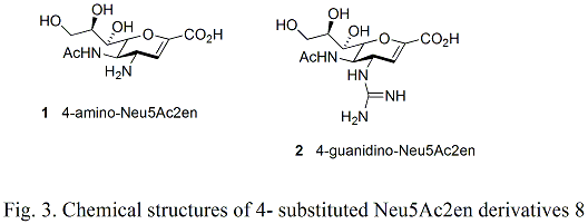 불포화 시알산 (''N''-아세틸뉴라민산 [Neu5Ac]) 유도체인 2-데옥시-2,3-디데하이드로-D-''N''-아세틸뉴라민산(Neu5Ac2en)은 시알로실 양이온 전이 상태 유사체로서 가장 강력한 억제제 핵심 템플릿으로 여겨진다.[15] 구조적으로 변형된 Neu5Ac2en 유도체는 더 효과적인 억제제를 제공할 수 있다.[15]많은 Neu5Ac2en 기반 화합물이 합성되어 인플루엔자 바이러스 뉴라미니데이스 억제 가능성을 테스트했다. 예를 들어 4-치환된 Neu5Ac2en 유도체, 4-아미노-Neu5Ac2en(화합물 1)은 Neu5Ac2en보다 두 자릿수 더 나은 인플루엔자 바이러스 시알리데이스 억제 효과를 보였으며, 자나미비르로 알려진 4-구아니디노-Neu5Ac2en(화합물 2)은 현재 인플루엔자 바이러스 치료제로 시판되고 있으며, 폰 이츠스타인과 연구진에 의해 설계되었다.[16]